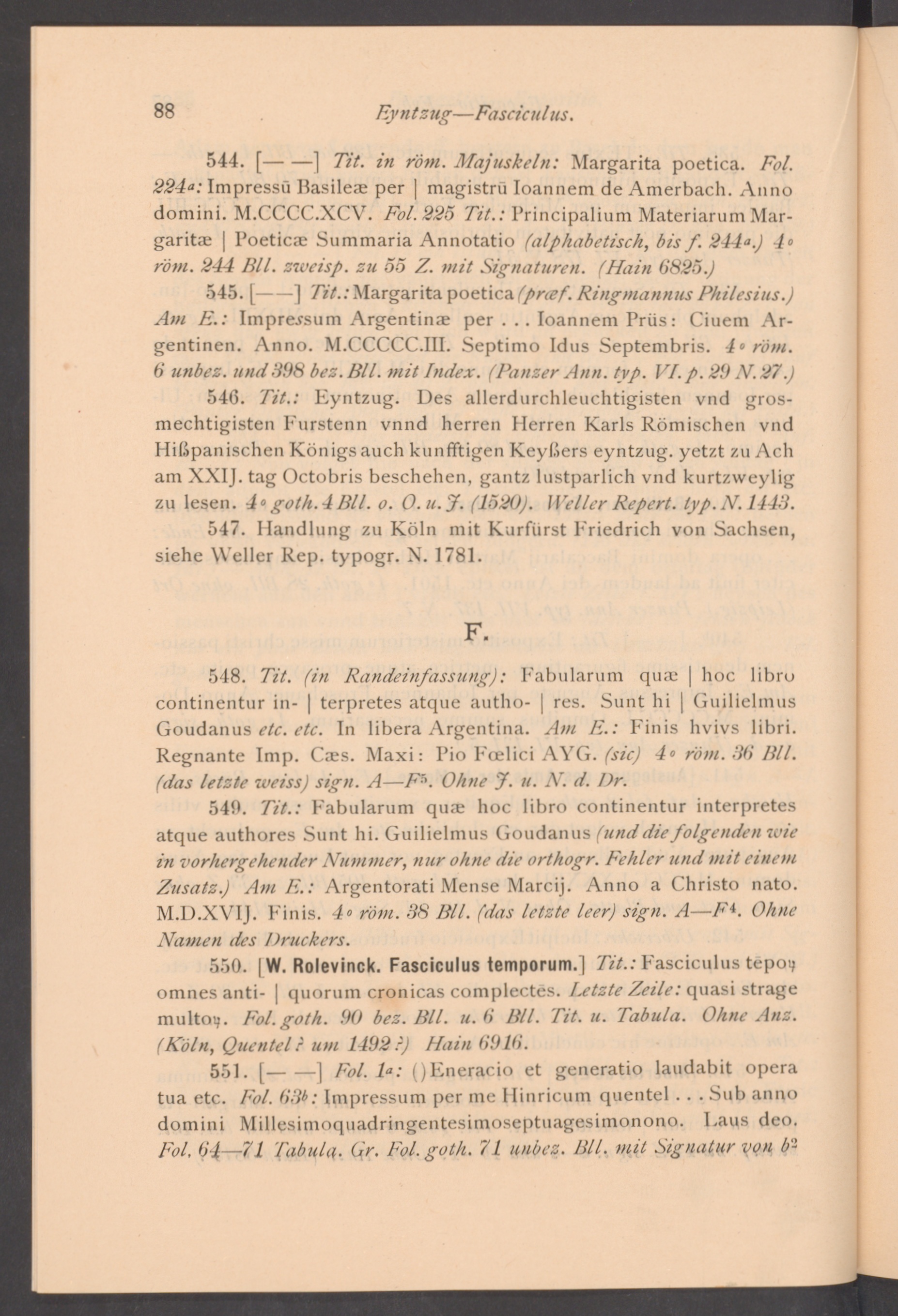 550. [W. Rolevinck. Fasciculus temporum.] Tit.: Fasciculus tepoijomnes anti- | quorum cronicas complectes. Ixtzte Zeile: quasi stragemultoi). Fol.goth. 90 bez. Bll. u. 0 Bll. Tit. u. Tabula. Ohne Anz.(Köln, Quentelc um 1492.j Ham 0910.