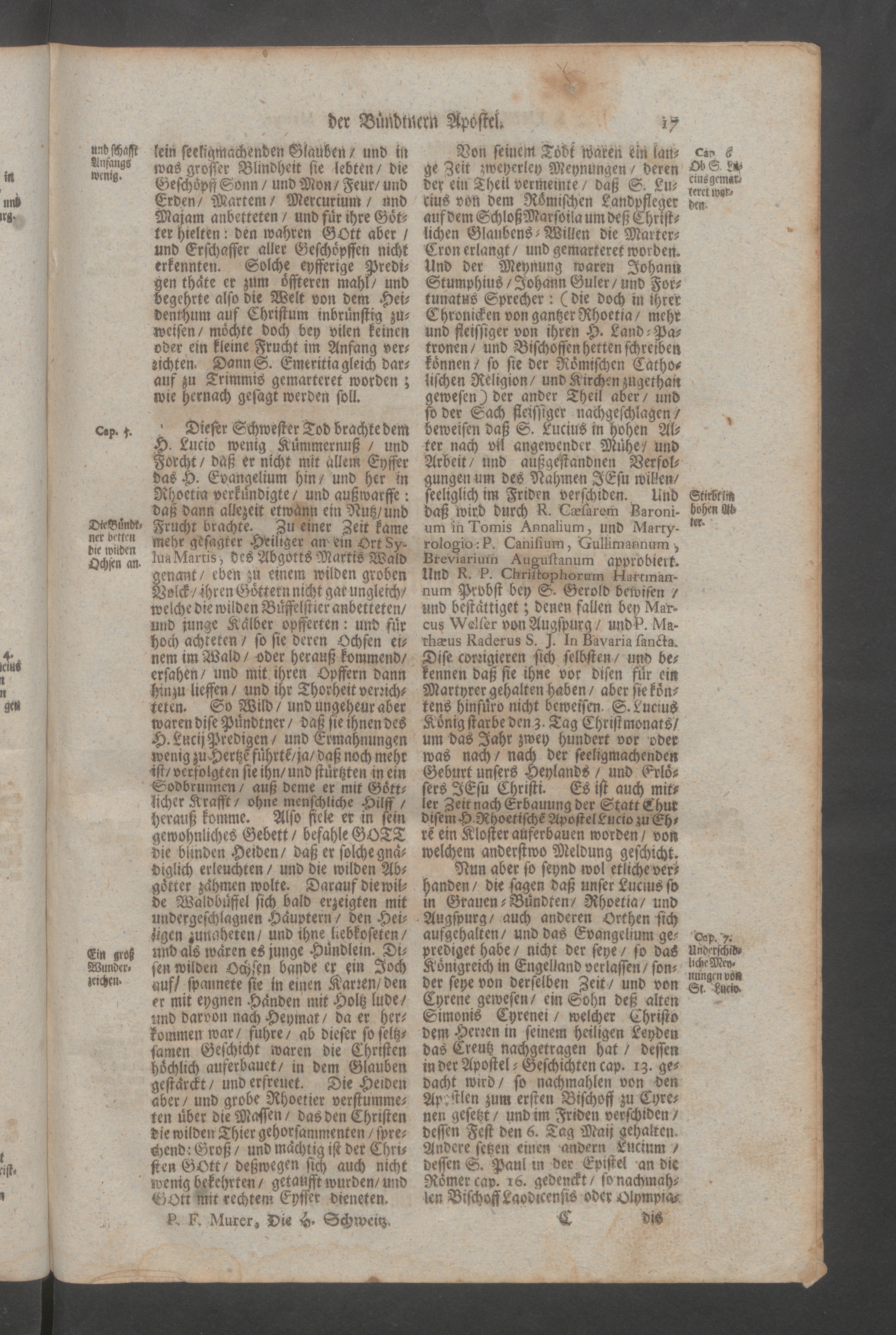 Helvetia Sancta, H. Schweitzer-Land : das ist ein Heiliger lustiger Blumen-Garten, und Paradeiss der Heiligen; oder Beschreibung aller Heiligen, so von Anfang der Christenheit in Heiligkeit des Lebens, und mancherley Wunderwercken, nicht allein in Schweitzerland, sondern auch an angräntzenden Orthen geleuchtet samt einem Zusatz von dem Heiligen Maryrer Fideli, und der Feyrlichen Enthebung des Seeligen Bruder Clausen, wie auch mit einem ausführlichen Register aller Heiligen, und Seeligen / <<seu>> Paradisus Sanctorum Helvetiae florum zusammen gezogen, und beschriben durch weyland den ehrwürdigen, und wohlgelehrten Herren, P.F. Henricum Murer, der Carthauss Ittingen Profess, und Procurator, etc.