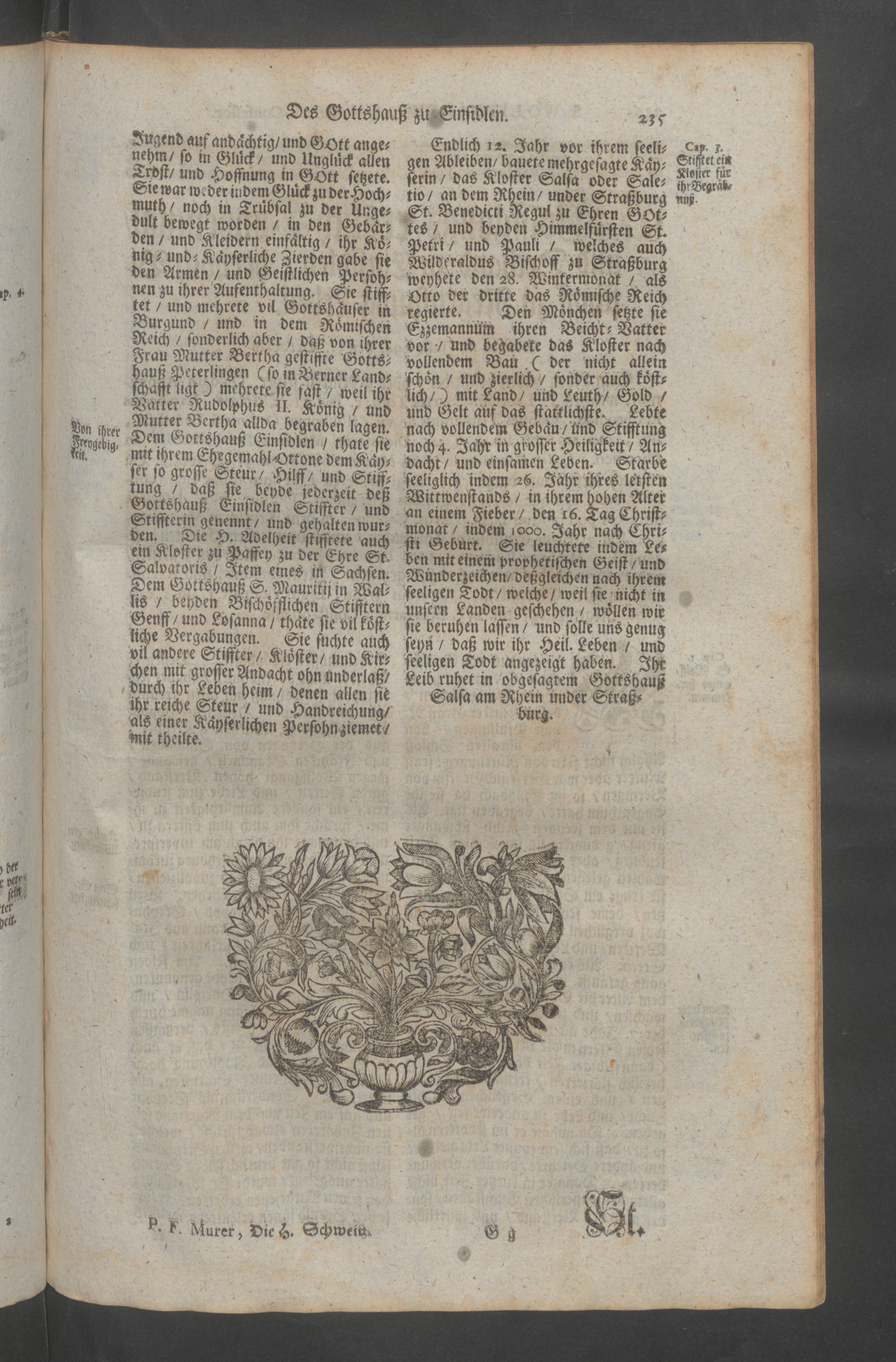 Helvetia Sancta, H. Schweitzer-Land : das ist ein Heiliger lustiger Blumen-Garten, und Paradeiss der Heiligen; oder Beschreibung aller Heiligen, so von Anfang der Christenheit in Heiligkeit des Lebens, und mancherley Wunderwercken, nicht allein in Schweitzerland, sondern auch an angräntzenden Orthen geleuchtet samt einem Zusatz von dem Heiligen Maryrer Fideli, und der Feyrlichen Enthebung des Seeligen Bruder Clausen, wie auch mit einem ausführlichen Register aller Heiligen, und Seeligen / <<seu>> Paradisus Sanctorum Helvetiae florum zusammen gezogen, und beschriben durch weyland den ehrwürdigen, und wohlgelehrten Herren, P.F. Henricum Murer, der Carthauss Ittingen Profess, und Procurator, etc.