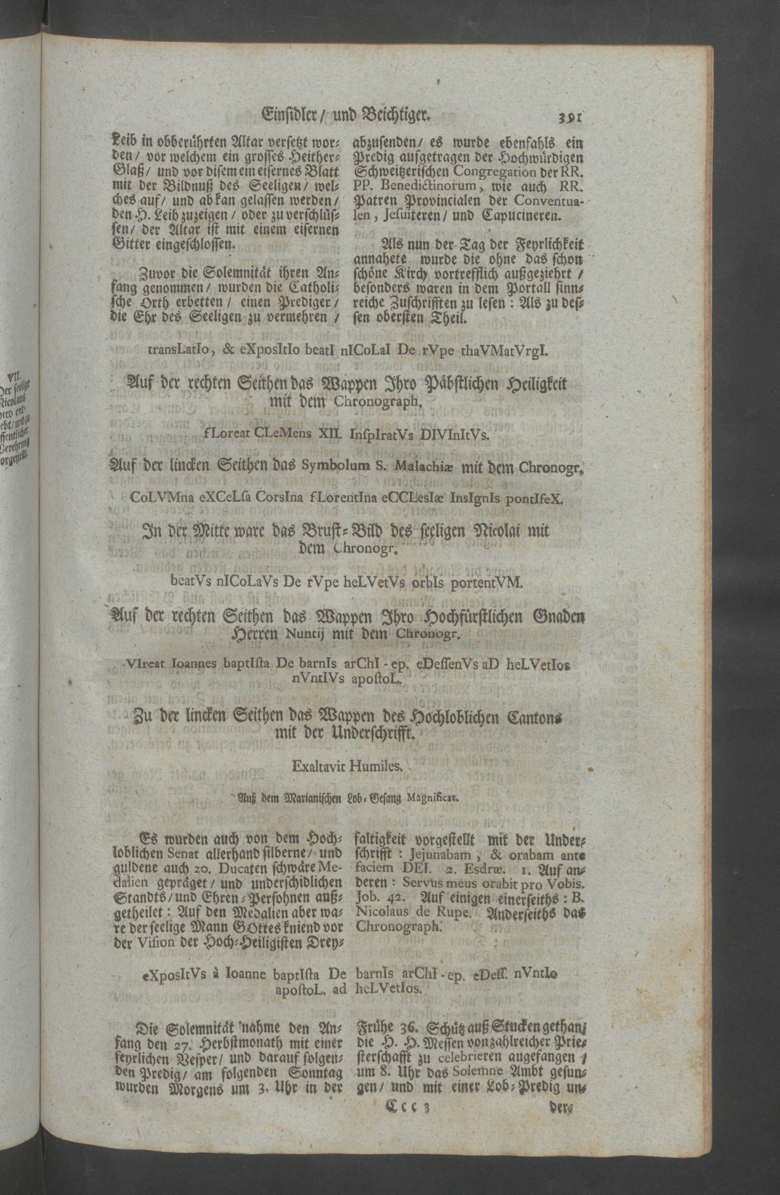 Helvetia Sancta, H. Schweitzer-Land : das ist ein Heiliger lustiger Blumen-Garten, und Paradeiss der Heiligen; oder Beschreibung aller Heiligen, so von Anfang der Christenheit in Heiligkeit des Lebens, und mancherley Wunderwercken, nicht allein in Schweitzerland, sondern auch an angräntzenden Orthen geleuchtet samt einem Zusatz von dem Heiligen Maryrer Fideli, und der Feyrlichen Enthebung des Seeligen Bruder Clausen, wie auch mit einem ausführlichen Register aller Heiligen, und Seeligen / <<seu>> Paradisus Sanctorum Helvetiae florum zusammen gezogen, und beschriben durch weyland den ehrwürdigen, und wohlgelehrten Herren, P.F. Henricum Murer, der Carthauss Ittingen Profess, und Procurator, etc.