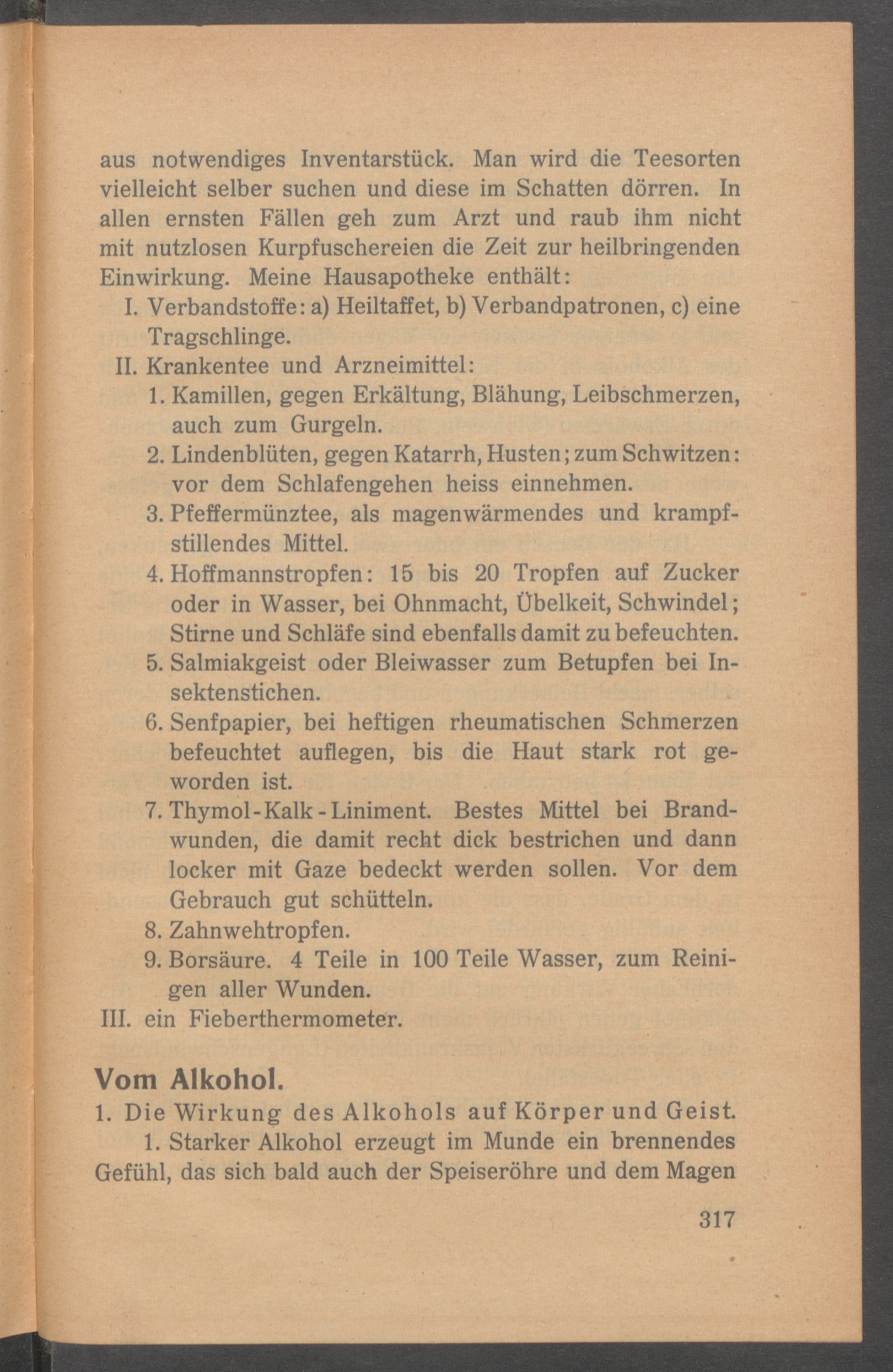 aus notwendiges Inventarstück. Man wird die Teesortenvielleicht selber suchen und diese im Schatten dörren. Inallen ernsten Fällen geh zum Arzt und raub ihm nichtmit nutzlosen Kurpfuschereien die Zeit zur heilbringendenEinwirkung. Meine Hausapotheke enthält: