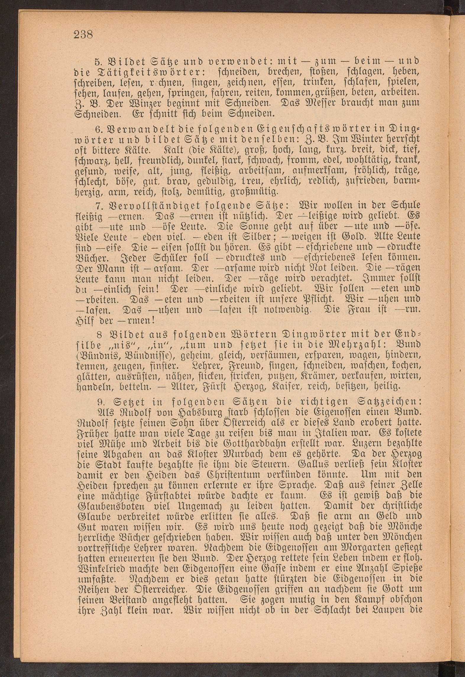 Als Rudolf von Habsburg starb schlössen die Eigeuossen einen Bund.Rudolf setzte seinen Sohn über Österreich als er dieses Land erobert hatte.Früher hatte mau viele Tage zu reisen bis man in Italien war. Es kosteteviel Mühe und Arbeit bis die Gotthardbahn erstellt war. Luzern bezahlteseine Abgaben an das Kloster Murbach dem es gehörte. Da der Herzogdie Stadt kaufte bezahlte sie ihm die Steuern. Gallus verließ sein Klosterdamit er den Heiden das Christentum verkünden könnte. Um mit denHeiden sprechen zu können erlernte er ihre Sprache. Daß aus seiner Zelleeine mächtige Fürstabtei würde dachte er kaum. Es ist gewiß daß dieGlaubensboten viel Ungemach zu leiden hatten. Damit der christlicheGlaube verbreitet würde erlitten sie alles. Daß sie arm an Geld undGut waren wissen wir. Es wird uns heute noch gezeigt daß die Möncheherrliche Bücher geschrieben haben. Wir wissen auch daß unter den Mönchenvortreffliche Lehrer waren. Nachdem die Eidgenossen am Morgarten gesiegthatten erneuerten sie den Bund. Der Herzog rettete sein Leben indem er floh.Winkelried machte den Eidgenosfen eine Gasse indem er eine Anzahl Spießeumfaßte. Nachdem er dies getan hatte stürzten die Eidgenossen in dieReihen der Österreicher. Die Eidgenossen griffen an nachdem sie Gott umfeinen Beistand angefleht hatten. Sie zogen mutig in den Kampf obschonihre Zahl klein war. Wir wissen nicht ob in der Schlacht bei Laupen die