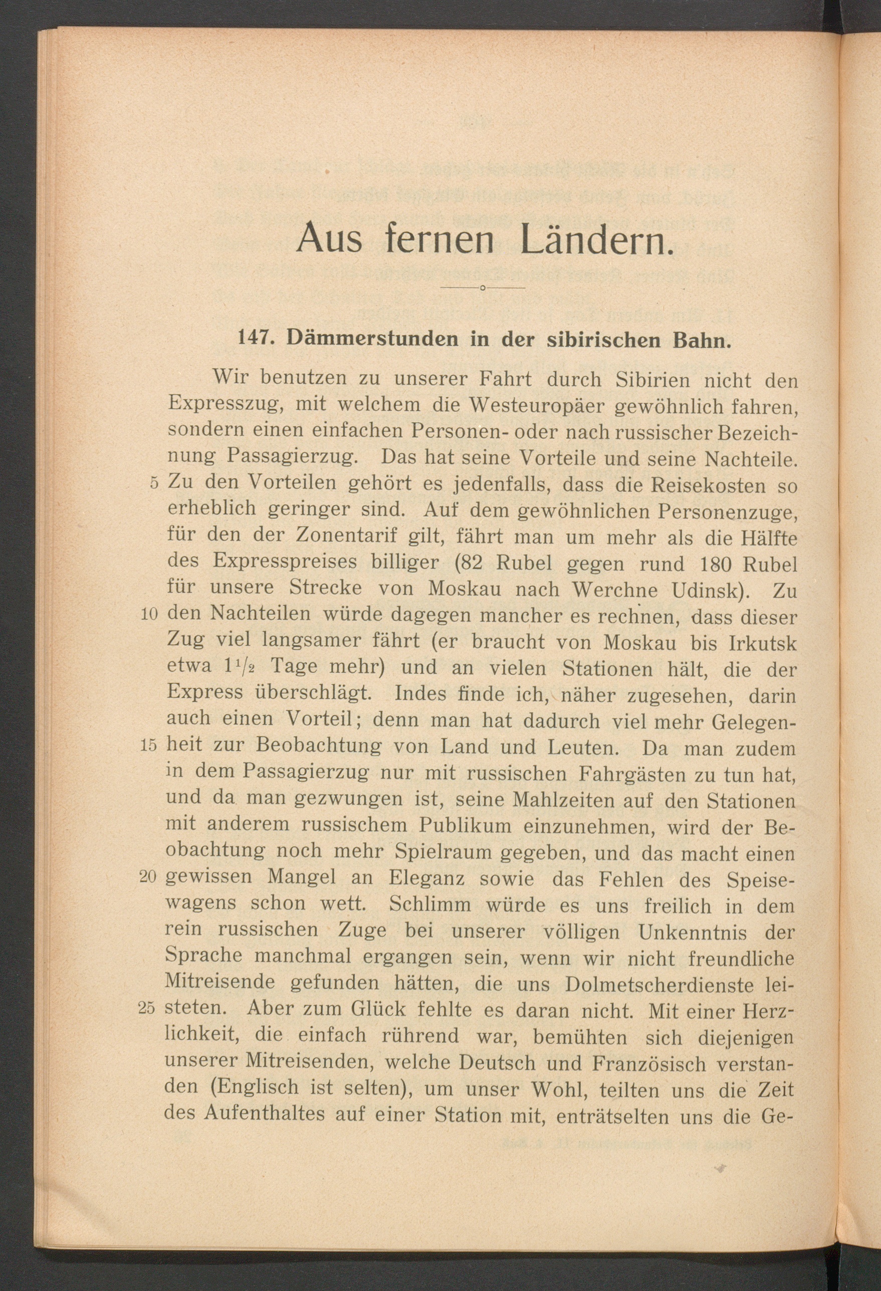 5 Zu den Vorteilen gehört es jedenfalls, dass die Reisekosten soerheblich geringer sind. Auf dem gewöhnlichen Personenzuge,für den der Zonentarif gilt, fährt man um mehr als die Hälftedes Expresspreises billiger (82 Rubel gegen rund 180 Rubelfür unsere Strecke von Moskau nach Werchne Udinsk). Zu10 den Nachteilen würde dagegen mancher es rechnen, dass dieserZug viel langsamer fährt (er braucht von Moskau bis Irkutsketwa D/a Tage mehr) und an vielen Stationen hält, die derExpress überschlägt. Indes finde ich, näher zugesehen, darinauch einen Vorteil; denn man hat dadurch viel mehr Gelegen-15 heit zur Beobachtung von Land und Leuten. Da man zudemin dem Passagierzug nur mit russischen Fahrgästen zu tun hat,und da man gezwungen ist, seine Mahlzeiten auf den Stationenmit anderem russischem Publikum einzunehmen, wird der Be-obachtung noch mehr Spielraum gegeben, und das macht einen20 gewissen Mangel an Eleganz sowie das Fehlen des Speise-wagens schon wett. Schlimm würde es uns freilich in demrein russischen Zuge bei unserer völligen Unkenntnis derSprache manchmal ergangen sein, wenn wir nicht freundlicheMitreisende gefunden hätten, die uns Dolmetscherdienste lei-25 steten. Aber zum Glück fehlte es daran nicht. Mit einer Herz-lichkeit, die einfach rührend war, bemühten sich diejenigenunserer Mitreisenden, welche Deutsch und Französisch verstan-den (Englisch ist selten), um unser Wohl, teilten uns die Zeitdes Aufenthaltes auf einer Station mit, enträtselten uns die Ge-