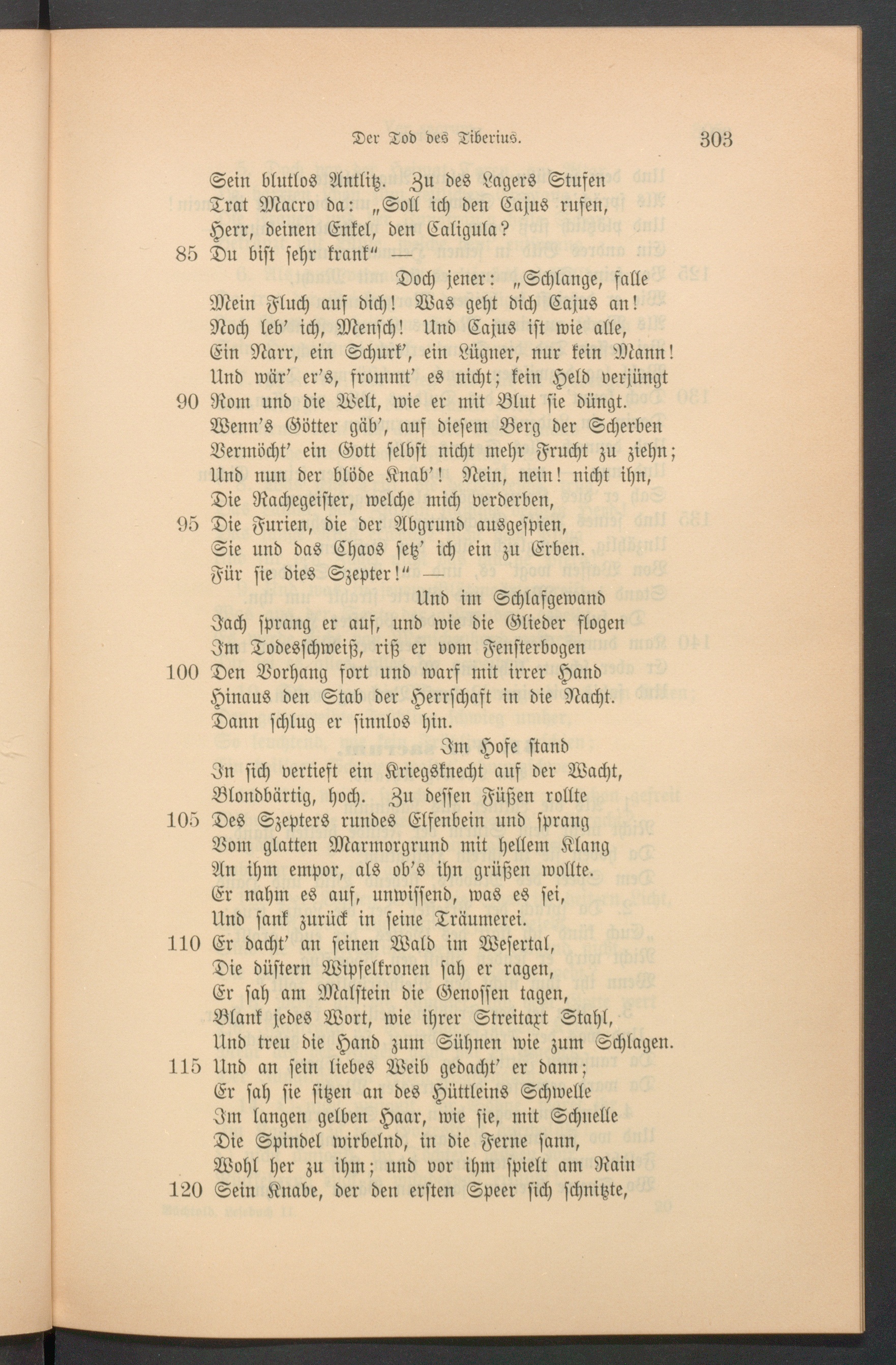 In sich vertieft ein Kriegsknecht auf der Wacht,Blondbärtig, hoch. Zu dessen Füßen rollte105 Des Szepters rundes Elfenbein und sprangVorn glatten Marmorgrund mit Hellem KlangAn ihm empor, als ob's ihn grüßen wollte.