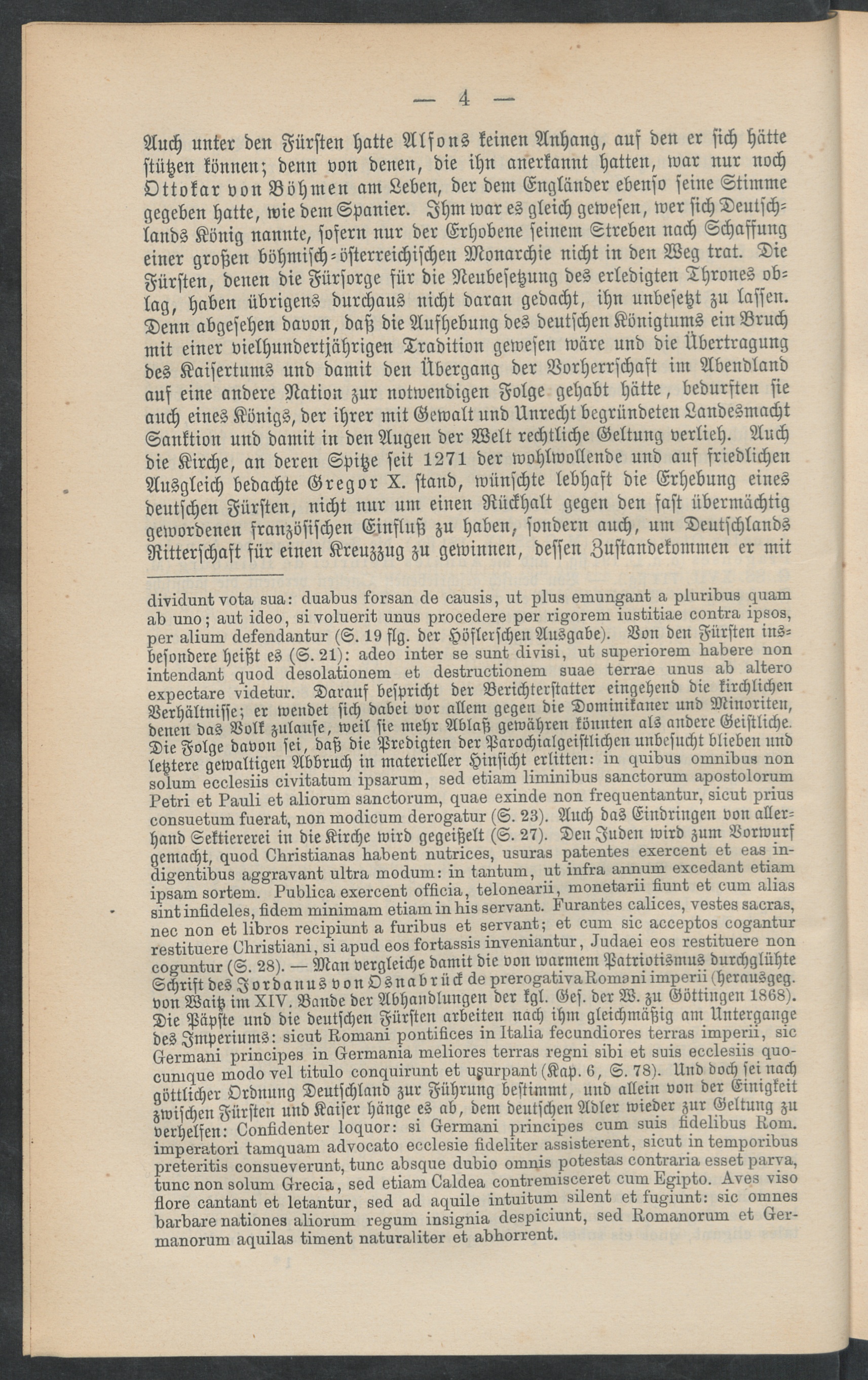 äiviäunt vota sua: äuabus torsan äs oausis, ut plus srnunZant a pturibus guarnab uns; aut iäso, si volusrit unus xroosäsrs psr riß-orsrn iustitias oontra ipsos,xsr atium äsksnäantur (S. 19 flg. der Höflerschen Ausgabe). Von den Fürsten ins-besondere heißt es (S. 21): aäso intsr 86 sunt äivisi, ut suxsriorsrn babsrs nonintsnäant guoä ässolationsm st ässtruotionsrn suas tsrras nnus ab altsrosxpsotars viästur. Darauf bespricht der Berichterstatter eingehend die kirchlichenVerhältnisse; er wendet sich dabei vor allem gegen die Dominikaner und Minoriten,denen das Volk zulaufe, weil sie mehr Ablaß gewähren könnten als andere Geistliche.Die Folge davon sei, daß die Predigten der Parochialgeistlichen unbesucht blieben undletztere gewaltigen Abbruch in materieller Hinsicht erlitten: in guibus ornnibus non8oluin soolssiis vivitatuin ipsarurn, 8sä stiain liininibus sanotorurn axostoloruinkstri st l?a>nli st alioruin sanotorum, guas sxinäs non trsgusntantur, 8iont priusoonsustum kusrat, non rnoäisnm äsroZatur (S. 23). Auch das Eindringen von aller-hand Sektiererei in die Kirche wird gegeißelt (S. 27). Den Juden wird zum Vorwurfgemacht, guoä Obristianas babsnt nutriesa, usuras patsntss sxsrosnt st sas in-äi^ontibus aAAravant uttra rnoäurn: in tantum, ut intra annuru sxosäant stiainipsain sortsin. kublioa sxsrosnt oktroia, tslonsarii, inonstarii trunt st onm aliassint inüäslss, üäoiu ininirnam stiain in bis sorvant. kurantss oalioss, vsstss saoras,nso non st libros rsoipiunt a kuribus st ssrvant; st ouin sio aoosptos ooZanturrsstitnsrs vbristiani, si apnä sos kortassis invsniantur, äuäasi eos rsstitusrs nonooxnntur (S. 28). — Man vergleiche damit die von warmem Patriotismus durchglühteSchrift desJordanusvonOsnabrückäs prsro^ativa Korns ni iinpsrii (herausgeg.von Waitz im XIV. Bande der Abhandlungen der kgl. Ges. der W. zu Göttingen 1868).Die Päpste und die deutschen Fürsten arbeiten nach ihm gleichmäßig am Untergängedes Imperiums: siout Roruani xontitioss in ltatia tsounäiorss tsrras impsrii, siodsrwani xrinoixss in dorrnania rnsliorss tsrras rsZni sibi st suis soolssiis guo-oumgus moäo vel titnlo oonguirunt st uxurpant (Kap. 6, S. 78). Und doch sei nachgöttlicher Ordnung Deutschland zur Führung bestimmt, und allein von der Einigkeitzwischen Fürsten und Kaiser hänge es ab, dem deutschen Adler wieder zur Geltung zuverhelfen: (lontiäsntsr loguor: si derrnani prinoipss onm suis tiäslibus Korn.irnxsratori tarnguarn aävooato soolssis tiäslitsr assistsrsnt, siout in tsrnxoribuspretsritis oonsusvsruut, tuno absgus äubio ornnis potestas oontraria sssst parva,tuno non solnrn Orsoia, ssä stiam Oaläsa oontrsinisosrst oum ItMpto. Xvss visoüors oantant st Istantur, ssä aä aguils intuituw silsnt st tiiMunt: sio omnssbarbars nationss alioruin rs^uin insignia ässpioiunt, ssä Lornanorunr st 6sr-rnanorurn aguilas tirnsnt natnralitsr st abborrsnt.