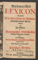 Darinn die gantze lobliche und zierliche Bawkunst, sampt den Grundlegungen und Auffzügen manigerley Gebäuwen, vollkomlich auss den Fundamenten gelehrt, und mit vielfeltigen Exemplen und Kunststucken, Antiquen und Neuwen, gantz deutlich erklert wirdt, wie auss des Authoris Vorred weitleuffiger zuvernemmen : Allen kunstlichen Handtwercken, Bawherren, Werckmeistern, Steinmetzen, Bildhawern, Schreineren, Mahleren, und allen so sich des Circkels und Richtscheits gebrauchen, hochdienstlich und nutzlich : Jetzundt zum ersten auss dem Italiänischen und Niderländischen, der Bawkunst liebhabern zu nutz, in die gemeine hochteutsche Sprache, auffs fleissigst verwendet und ubergesetztGetruckt zu Basel : Jn verlegung Ludwig Königs, 1608-1609e-raraMathematisches Lexicon darinnen die in allen Theilen der Mathematick üblichen Kunst-Wörter erkläret, und zur Historie der Mathematischen Wissenschaften dienliche Nachrichten ertheilet