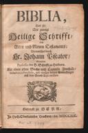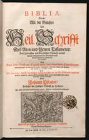auss hebreischer und griechischer Spraach, in welchen sie anfangs von den Propheten und Aposteln geschriben, jetzund aufs new verteutscht : auch eines jeden Buchs und Capitels Inhalt, samt beygefügten Concordantzen, und angehängter Erklärung der tunckeln Geschichten, Worten, Reden und Sachen, aufs kürtzest und einfaltigst verfasset : ferner die Apocrypha, das ist, die Bücher, welche von alters an das Alte Testament angehengt werden, wiewol sie nicht durch prophetischen Geist, noch in hebreischer Spraach geschriben sind, aufs new verteutschtGetruckt zu Bärn : in Hoch-Oberkeitlicher Truckerey, durch Andreas Hügenet, im Jahr Christi 1684e-raraBiblia, Das ist: Die gantze Heilige Schrifft/ Deß Alten und Neuen Testaments