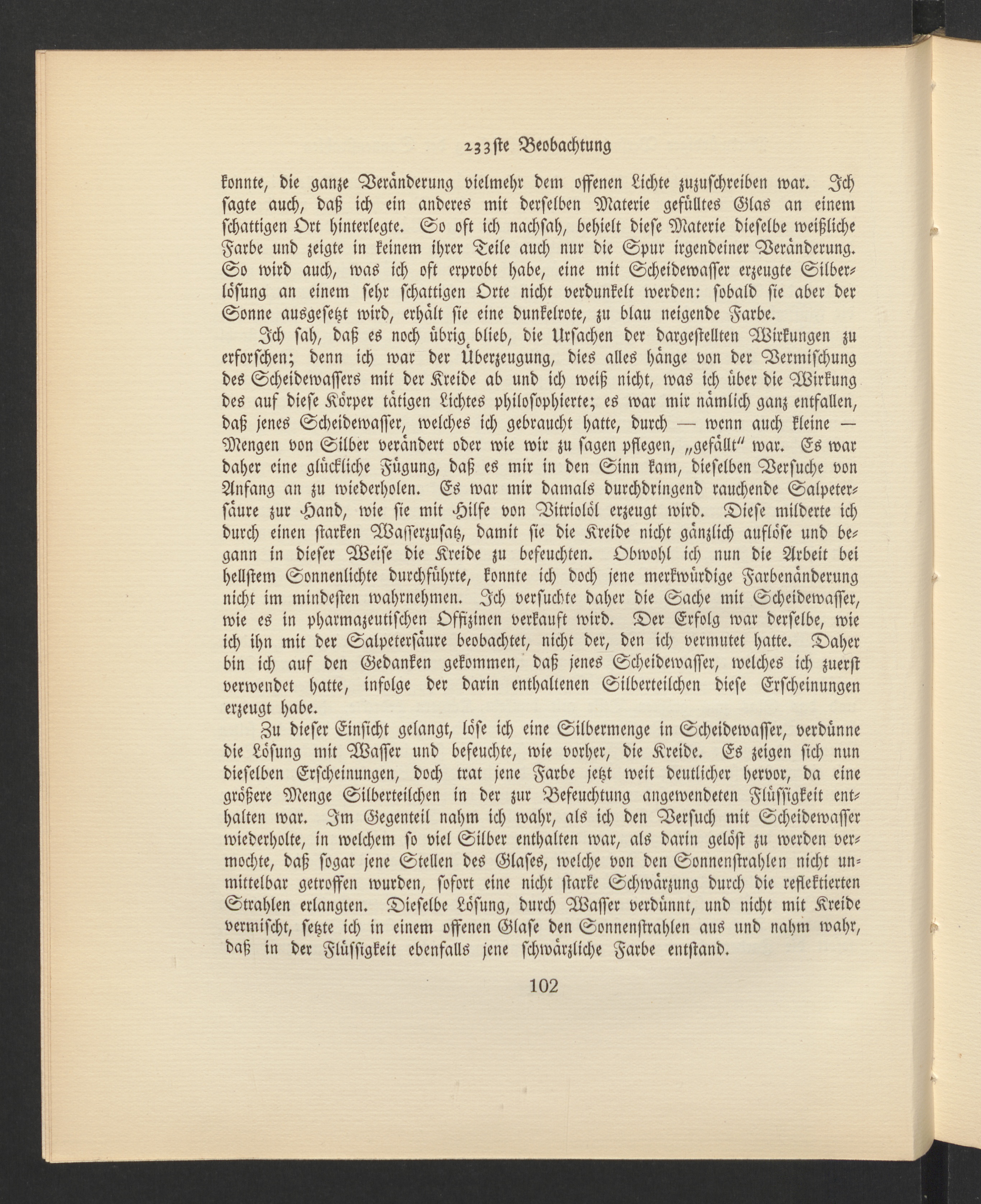 Ich sah, daß es noch übrig, blieb, die Ursachen der dargestellten Wirkungen zuerforschen; denn ich war der Überzeugung, dies alles hänge von der Vermischungdes Scheidewassers mit der Kreide ab und ich weiß nicht, was ich über die Wirkungdes auf diese Körper tätigen Lichtes philosophierte; es war mir nämlich ganz entfallen,daß jenes Scheidewasser, welches ich gebraucht hatte, durch — wenn auch kleine —Mengen von Silber verändert oder wie wir zu sagen pflegen, „gefällt" war. Es wardaher eine glückliche Fügung, daß es mir in den Sinn kam, dieselben Versuche vonAnfang an zu wiederholen. Es war mir damals durchdringend rauchende Salpeter-säure zur Hand, wie sie mit Hilfe von Vitriolöl erzeugt wird. Diese milderte ichdurch einen starken Wasserzusatz, damit sie die Kreide nicht gänzlich auflöse und be-gann in dieser Weise die Kreide zu befeuchten. Obwohl ich nun die Arbeit beihellstem Sonnenlichte durchführte, konnte ich doch jene merkwürdige Farbenänderungnicht im mindesten wahrnehmen. Ich versuchte daher die Sache mit Scheidewasser,wie es in pharmazeutischen Offizinen verkauft wird. Der Erfolg war derselbe, wieich ihn mit der Salpetersäure beobachtet, nicht der, den ich vermutet hatte. Daherbin ich auf den Gedanken gekommen, daß jenes Scheidewasser, welches ich zuerstverwendet hatte, infolge der darin enthaltenen Silberteilchen diese Erscheinungenerzeugt habe.