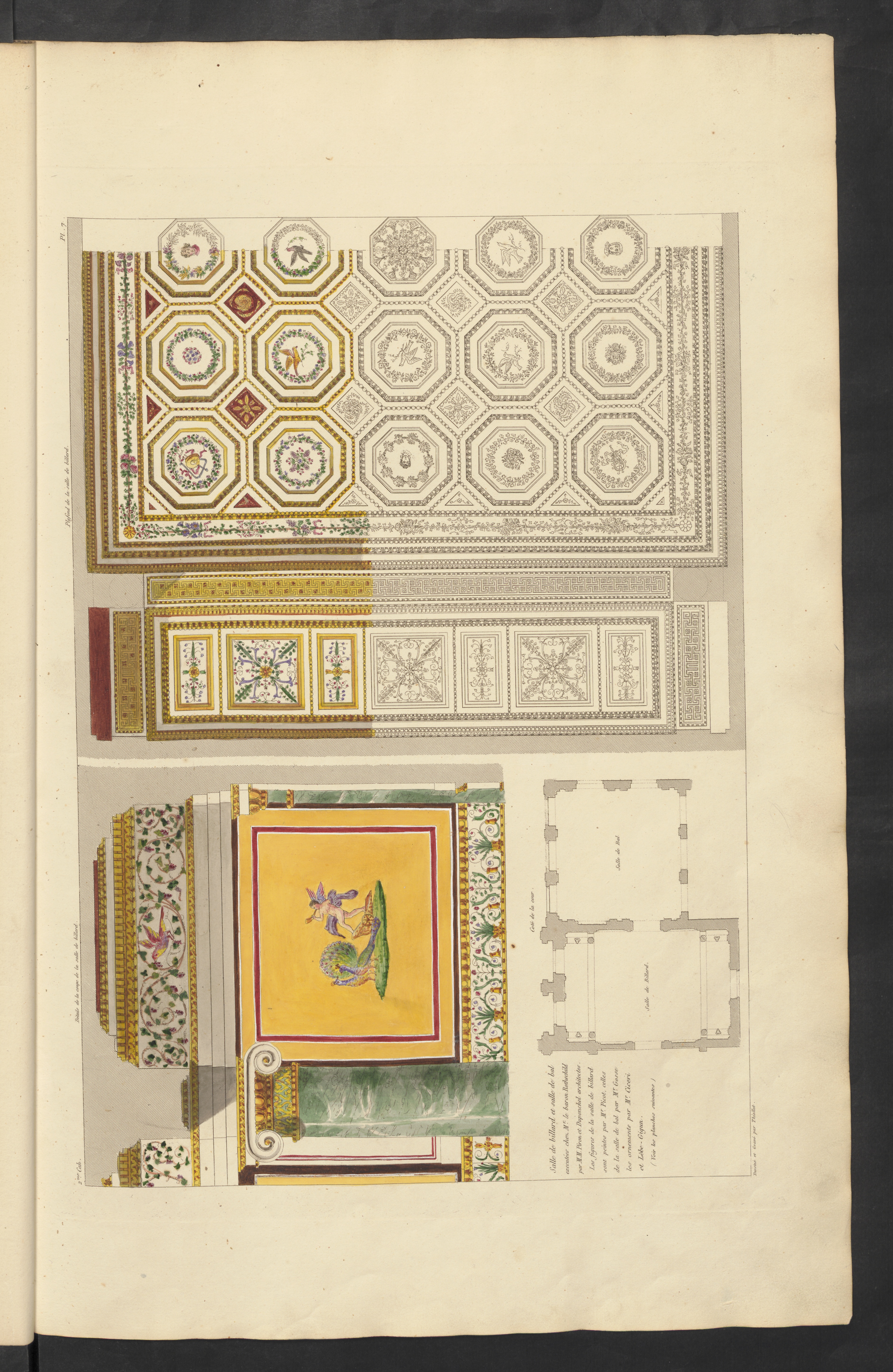 Nouveau recueil de menuiserie et de décorations intérieures et extérieures : intérieurs d'appartements, salles de bals et de concerts, foyers de théatres, intérieurs et extérieurs de boutiques, cafés, restaurants, bazars, galeries marchandes, etc., etc. ; décorations de fètes et cérémonie civiles et religieuses, etc. etc. : contenant en outre un choix de grosse menuiserie et de charpenterie légère combinées avec le fer, et divers objets introduits depuis peu dans les jardins et autres rendez-wous publics, tels que urinoirs, guérites ornées, tentes pour la lecture, etc., etc / le tout levé, dessiné et gravé par Thiollet et H. Roux