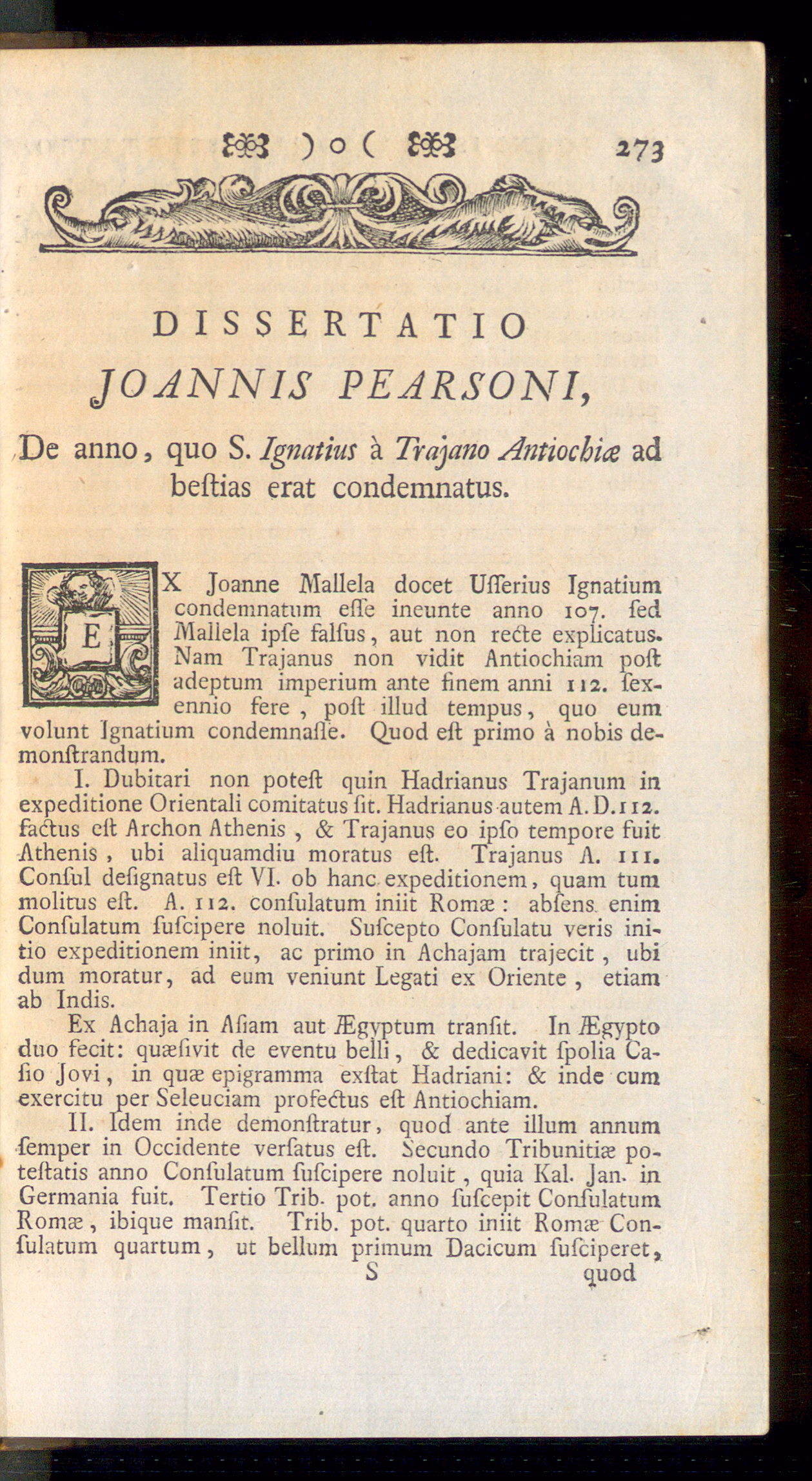 X Joanne Mallela docet Ufferius Ignatiumcondemnatum ekle ineunte anno 107. sedMallela ipse falsus, aut non recte explicatus.Nam Trajanus non vidit Antiochiam postadeptum imperium ante finem anni 112. sex-ennio fere , post illud tempus, quo eumvolunt Ignatium condemnasse. Quod est primo a nobis de-monstrandum.