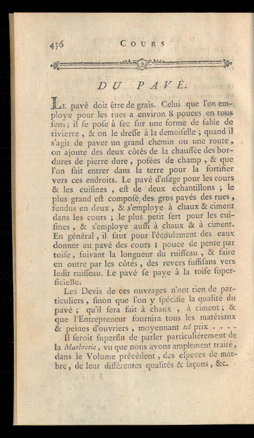 Les Devis de ces ouvrages n’ont rien de par-ticuliers , sinon que l’on y spécifie la qualité dupavé ; qu’il sera fait à chaux , à ciment ; &que l’Entreprcneur fournira tous les matériaux& peines d’ouvriers , moyennant td prix . . . .