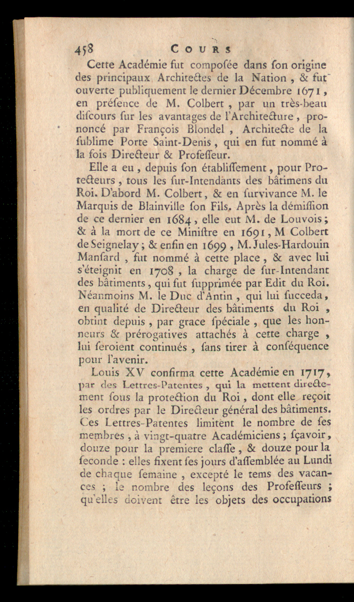 Cette Académie sut composée dans son originedes principaux Architectes de la Nation , & fut'ouverte publiquement le dernier Décembre 1671,en présence de M. Colbert , par un très-beaudiscours fur les avantages de l’Architecture , pro-noncé par François Blondel , Architecte de lasublime Porte Saint-Denis , qui en fut nommé àla fois Directeur & Professeur.