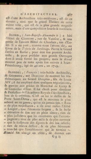 BlONDEL , ( François ) très-habile Architecte k& Géomètre , sut lhonneur de montrer les Ma-thématiques au Grand Dauphin , fils de LouisXIV ; il fut employé dans quelques négociations ,& parvint aux grades de Maréchal de Camp &de Conseiller d’JÈtat. II fut choisi pour directeur& Professeur de l’Académie Royale d’Architecture ,lors de sa création. C'est de lui le destin de laPorte Saint-Denis , qui est le morceau le plusachevé en ce genre, qu’on ait jamais fait. " Rien-, de plus majestueux , a dit avec raifort l’Abbé» Laugier , que l’étonante largeur , & la belle>» élévation de son arc en plein cintre ; rien de« plus judicieux que les ornements qui l’accom-» pagnent ; rien de plus mâle & de plus nerveux-, que la sculpture des figures & des bas reliefs;» rien de mieux destiné , & de plus fièrement» tranché que l’cntablement qui le termineMlondd fut chargé en 1660 , de donner ues