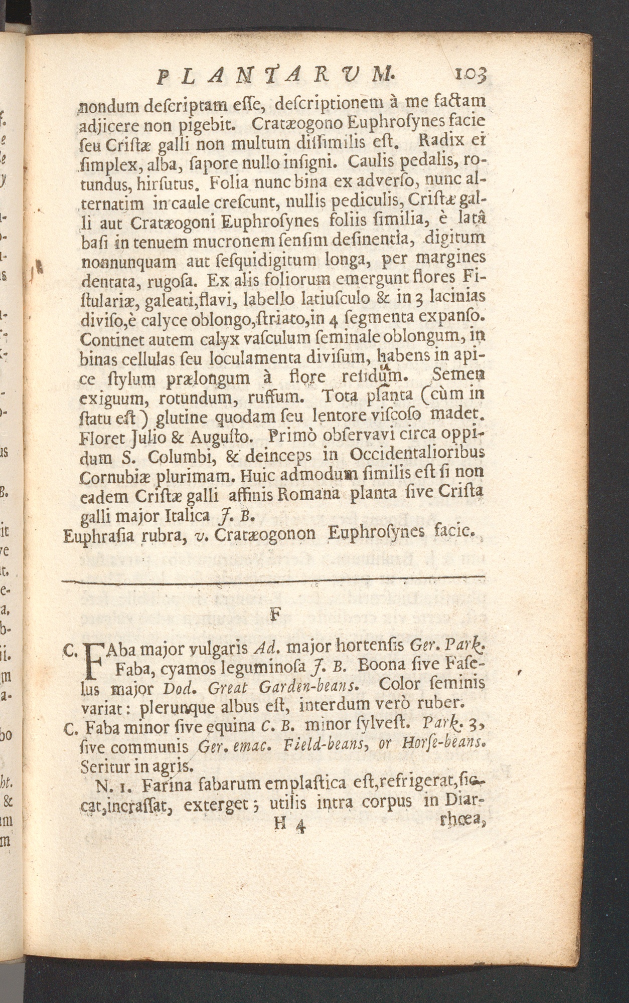 jiondum descriptam esse, descriptionem ä me factamadjicere non pigebit. Cratasogono Euphrosynes facieseu Crite galli non multum distimilis est. Radix eisimplex, alba, sapore nullo instgni. Caulis pedalis, ro-tundus, hirsutus. Folia nunc bina ex adverso, nunc al-ternarim in caule crescunt, nullis pediculis. Crista; gal-li aut Cratasogoni Euphrosynes foliis similia, e latabasi in tenuem mucronem sensim desinenda, digitumnonnunquam aut sesquidigitum longa, per marginesdentata, rugosa. Ex alis foliorum emergunt flores Fi-stularia;, galeati,flavi, labello latiufculo & in 3 laciniasdiviso,e calyce oblongo,striato,in 4 segmenta expanso.Continet autem calyx vasculum seminale oblongum, inbinas cellulas seu loculamenta divisum, habens in api-ce stylum pradongum a flore relidum. Semenexiguum, rotundum, russum. Tota planta (cum instatu est ) glutine quodam seu lentore viscoso madet.Floret Julio & Augusto. Primo observavi circa oppi-dum S. Columbi, & deinceps in OccidentalioribusCornubite plurimam. Huic admodum similis est fi noneadem Cristas galli affinis Romana planta sive Cristagalli major Italica J. B.