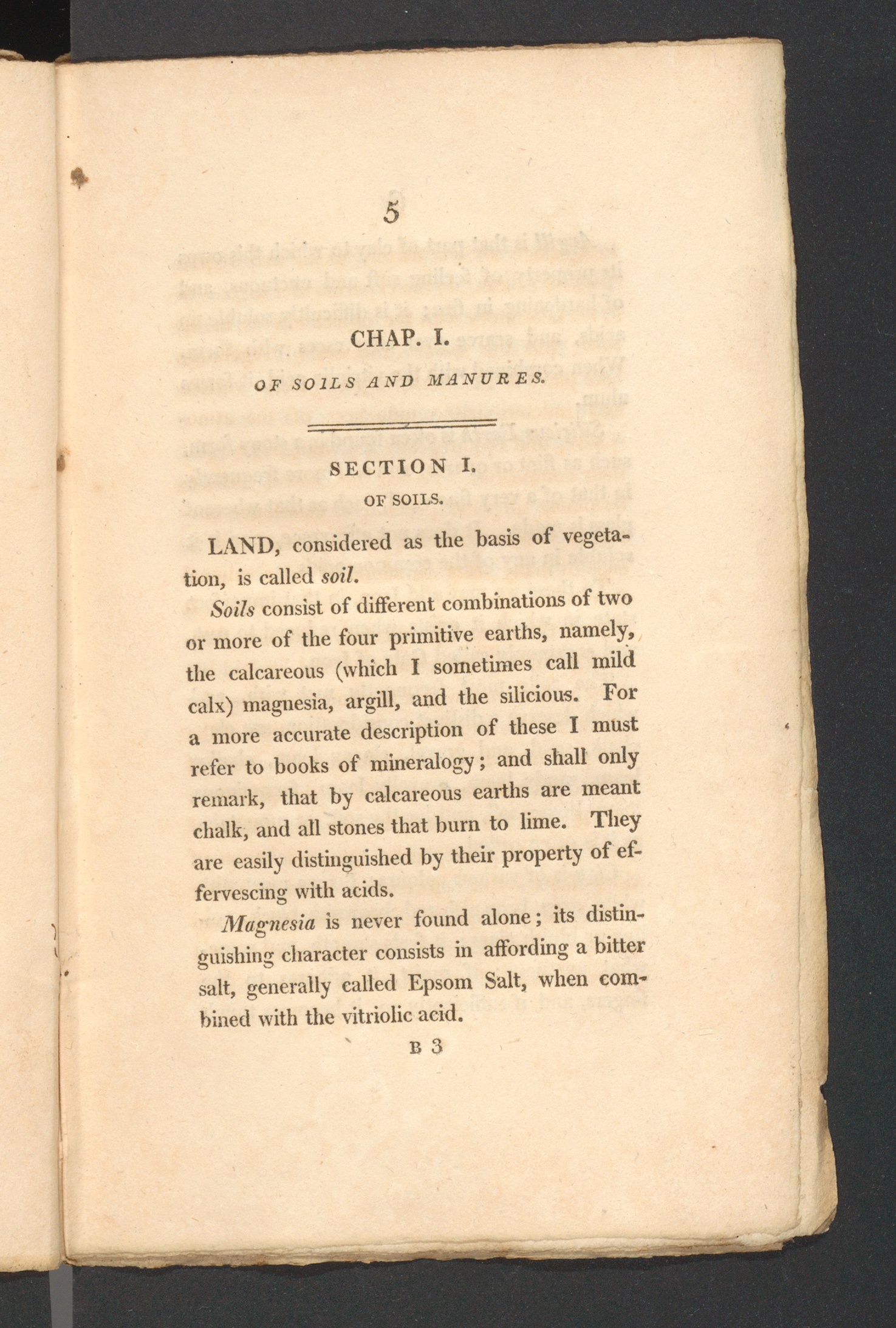 Soils consist of different combinations of twoor more of the four primitive earths, namely,the calcareous (which I sometimes call mildcalx) magnesia, argill, and the silicious. Fora more accurate description of these I mustrefer to books of mineralogy; and shall onlyremark, that by calcareous earths are meantchalk, and all stones that burn to lime. Theyare easily distinguished by their property of ef-fervescing with acids.