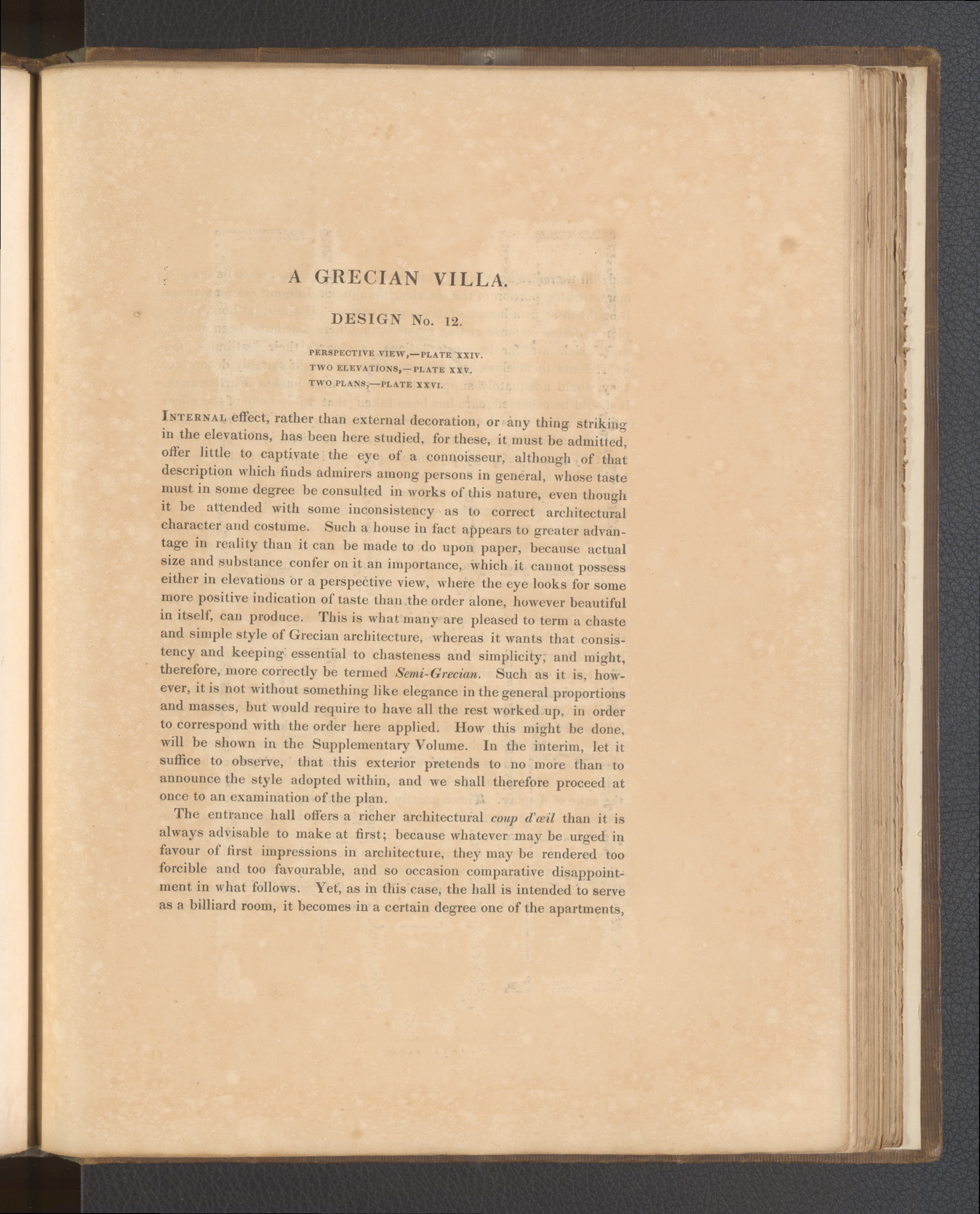 Internal effect, rather than external decoration, or any thing strikingin the elevations, has been here studied, for these, it must be admitted,offer little to captivate the eye of a connoisseur, although of thatdescription which finds admirers among persons in general, whose tastemust in some degree be consulted in works of this nature, even thoughit be attended with some inconsistency as to correct architecturalcharacter and costume. Such a house in fact appears to greater advan-tage in reality than it can be made to do upon paper, because actualsize and substance confer on it an importance, which it cannot possesseither in elevations or a perspective view, where the eye looks for somemore positive indication of taste than the order alone, however beautifulin itself, can produce. This is what many are pleased to term a chasteand simple style of Grecian architecture, whereas it wants that consis-tency and keeping' essential to chasteness and simplicity; and might,therefore, more correctly be termed Semi-Grecian. Such as it is, how-ever, it is not without something like elegance in the general proportionsand masses, but would require to have all the rest worked up, in orderto correspond with the order here applied. How this might be done,will be shown in the Supplementary Volume. In the interim, let itsuffice to observe, that this exterior pretends to no more than toannounce the style adopted within, and we shall therefore proceed atonce to an examination of the plan. ji . _ >