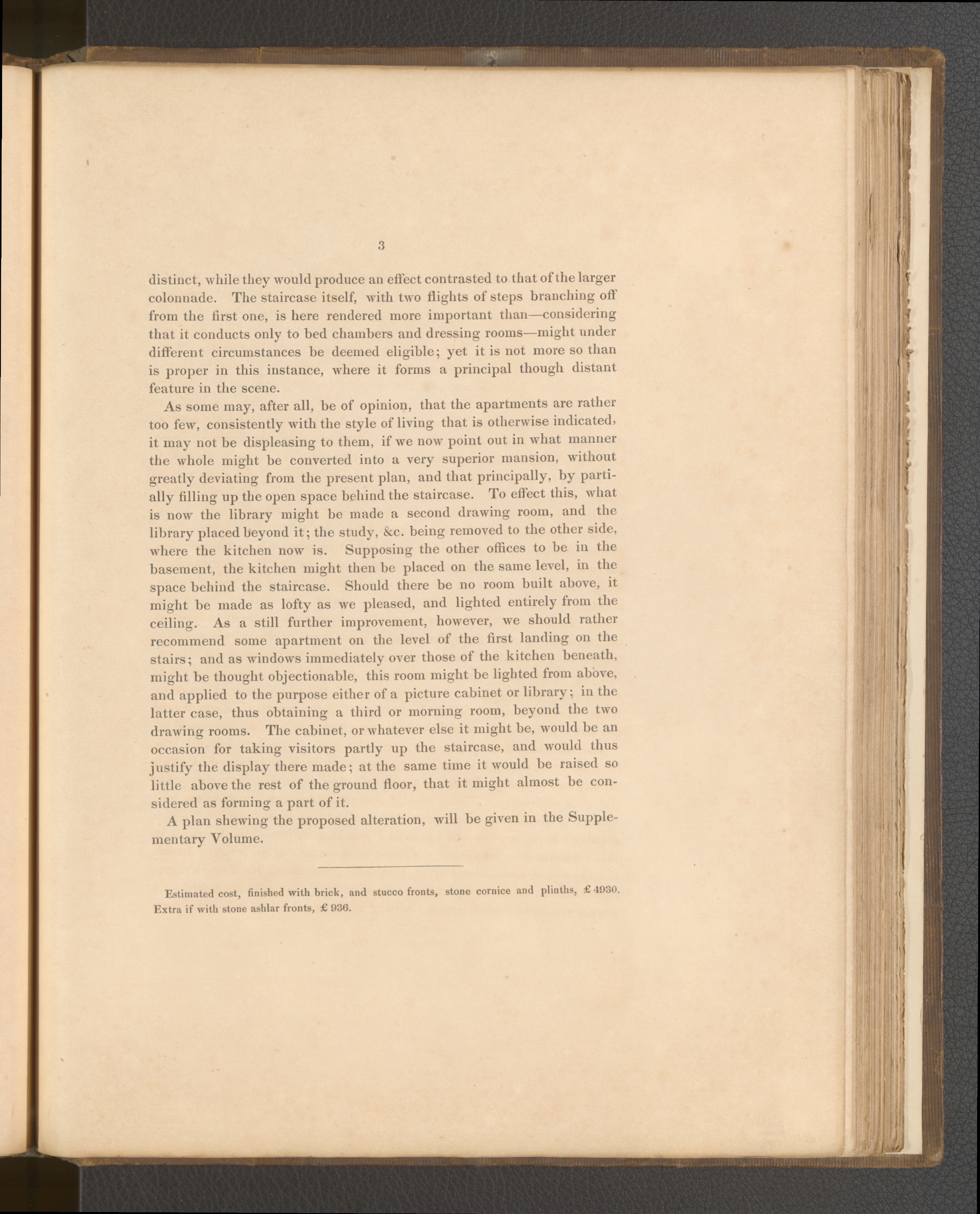 Estimated cost, finished with brick, and stucco fronts, stone cornice and plinths, £4930.Extra if with stone ashlar fronts, £ 936.