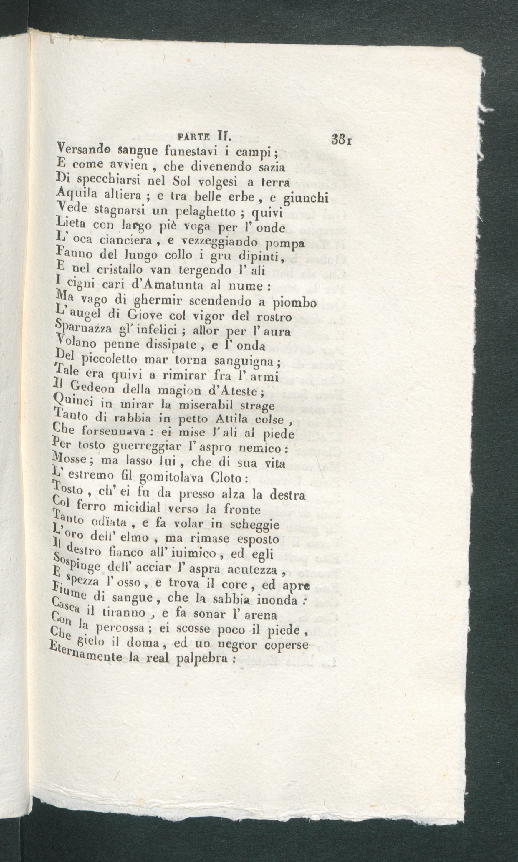 Che 1 orseuuava : ei mise J'ali al piedeLer tosto guerreggiar F aspro nemico :Mosse; ma lasso lui, che di sua vitaL’estremo {il gomitolava doto:jf°sto , di’ ei fu da presso alza la destraC°1 ferro micidial verso la fronte» ante, odiala , e fa volar in sebeggie^ oro dell’elmo, ma rimase esposto£ destro fianco all’ iuimico, ed egli£° s Piuge dell’ acciar F aspra acutezza ,j.. s Pezza F osso , e trova il core , ed apredi sangue , che la sabbia inonda .*p USCi * il inanno , e fa sonar F arenaq r ‘ Ja percossa ; ei scosse poco il piede ,jv t >e gielo il doma , ed un negror coperseinamente la reai palpebra :