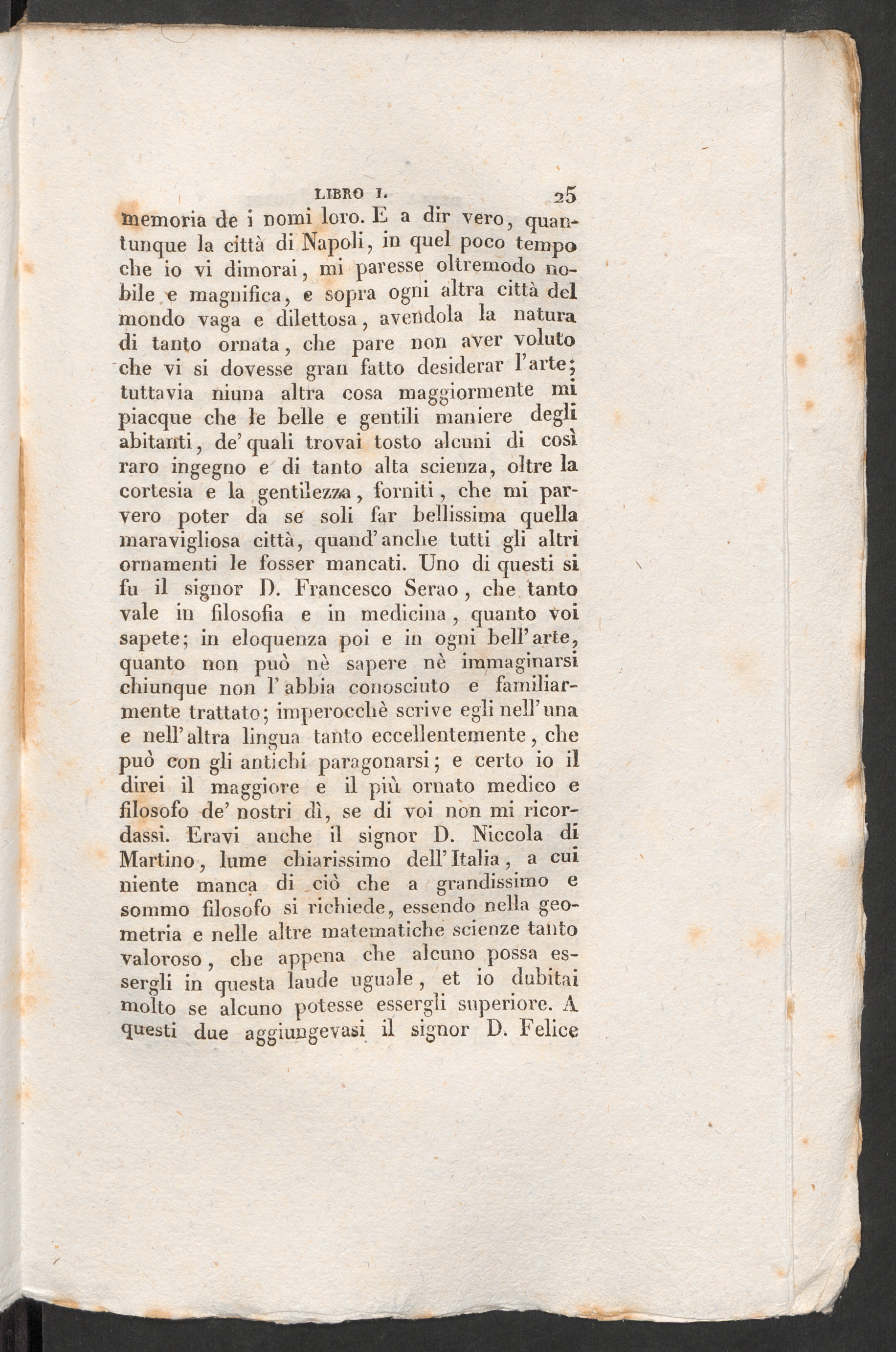 memoria de i nomi loro. E a dir vero, quan-tunque la città di Napoli , in quel poco tempoche io vi dimorai, mi paresse oltremodo no-bile e magnifica, e sopirà ogni altra città delmondo vaga e dilettosa, avendola la naturadi tanto ornata, che pare non aver volutoche vi si dovesse gran fatto desiderar l’arte;tuttavia niuna altra cosa maggiormente mipiacque che le belle e gentili maniere degliabitanti, de’ quali trovai tosto alcuni di cosìraro ingegno e di tanto alta scienza, oltre lacortesia e la gentilezza, forniti, che mi par-vero poter da se soli far bellissima quellamaravigliosa città, quand’anche tutti gli altriornamenti le fosser mancati. Uno di questi sifu il signor D. Francesco Serao , che tantovale in filosofia e in medicina, quanto voisapete; in eloquenza poi e in ogni bell’arte,quanto non può nè sapere nè immaginarsichiunque non l’abbia conosciuto e familiar-mente trattato; imperocché scrive egli nell’unae nell’ altra lingua tanto eccellentemente, chepuò con gli antichi paragonarsi; e certo io ildirei il maggiore e il più ornato medico efilosofo de’ nostri dì, se di voi non mi ricor-dassi. Eravi anche il signor D. Niccola diMartino, lume chiarissimo dell’ Italia , a cuiniente manca di ciò che a grandissimo esommo filosofo si richiede, essendo nella geo-metria e nelle altre matematiche scienze tantovaloroso, che appena che alcuno possa es-sergli in questa laude uguale, et io dubitaimolto se alcuno potesse essergli superiore. Aquesti due aggiungevasi il signor D. Felice
