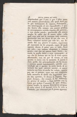 disputandosi per 1’ una e per l’altra partecon somma piacevolezza; alle quali dava perlo più incitamento la signora Principessa ,ora interrogando et ora rispondendo ; e que-sto faceva ella sempre con sommo giudizioet accorgimento, avendo rispetto alle persone,e con poche parole ; perciocché ella amavameglio di udire che di essere udita : nellaqual cosa sola noi le eravamo tutti contrarj;perciocché non era alcun di noi che non sifosse volentieri taciuto per udir lei ; ma fa-cendo del suo piacere il nostro, seguivamogli argomenti da lei proposti, sopra de’qualiognuno diceva il parer suo, e tutti, fuorime solo , con somma eloquenza e sommagrazia ; così che mi pareva esser beato , es-sendo in quella dolce e cara compagnia ; etora che la fortuna me ne ha di tanto spazioallontanato, non mi par di vivere, se nonquanto vi torno con la memoria. E questo èstato quello che principalmente mi ha mossoa scrivere questi ragionamenti , perchè scri-vendogli mi è paruto in certo modo di ri-tornare tra quei valorosi uomini, et esseretuttavia con loro ; et anche ho voluto, quantoper me si potesse, esser con essi congiuntonella memoria di quelli che leggeranno que-sta mia operetta, se alcuno la leggerà. Sap-piate dunque, che avendo il Re diliberatoun giorno di andare a Baj'a insieme con laReina per godere l’amenità di quei delizio-sissimi luoghi, la signora Principessa proposedi voler essere il dì davanti verso la sera aPozzuolo, per ritrovarsi poi il giorno appresso