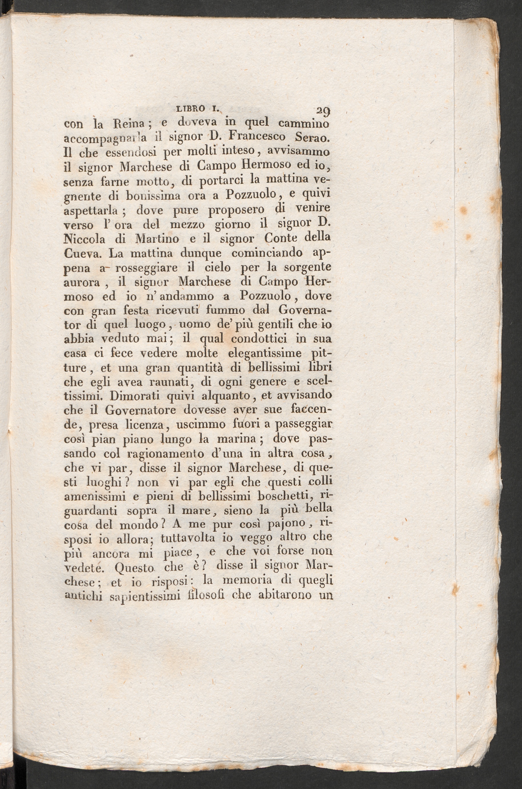 con la Reina ; e doveva in quel camminoaccompagnarla il signor D. Francesco Serao .Il che essendosi per molti inteso, avvisammoil signor Marchese di Campo Hermoso ed io,senza farne motto, di portarci la mattina ve-gnente di booissima ora a Pozzuolo, e quiviaspettarla ; dove pure proposero di venireverso l’ora del mezzo giorno il signor D.Niccola di Martino e il signor Conte dellaCueva. La mattina dunque cominciando ap-pena a- rosseggiare il cielo per la sorgenteaurora , il signor Marchese di Campo Her-moso ed io li 7 andammo a Pozzuolo, dovecon gran festa ricevuti fummo dal Governa-tor di quel luogo, uomo de 7 più gentili che ioabbia veduto mai ; il qual condottici in suacasa ci fece vedere molte elegantissime pit-ture , et una gran quantità di bellissimi libriche egli avea raunati, di ogni genere e scel-tissimi. Dimorati quivi alquanto, et avvisandoche il Governatore dovesse aver sue faccen-de , presa licenza, uscimmo fùori a passeggiarcosì pian piano lungo la marina ; dove pas-sando col ragionamento d’una in altra cosa,che vi par, disse il signor Marchese, di que-sti luoghi ? non vi par egli che questi colliamenissimi e pieni di bellissimi boschetti, ri-guardanti sopra il mare, sieno la più bellacosa del mondo ? A me pur così pajono, ri-sposi io allora; tuttavolta io veggo altro chepiù ancora mi piace, e che voi forse nonvedete. Questo che è ? disse il signor Mar-chese ; et io risposi: la memoria di quegliantichi sapientissimi lìlosofi che abitarono un