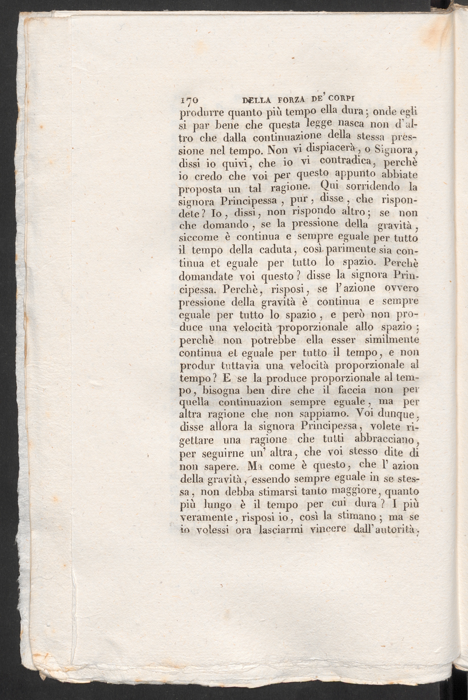 10 credo che voi per questo appunto abbiateproposta un tal ragione. Qui sorridendo lasignora Principessa , pur 5 disse , che rispon-dete ? Io, dissi, non rispondo altro 5 se nonche domando , se la pressione della gravità ,siccome è continua e sempre eguale per tutto