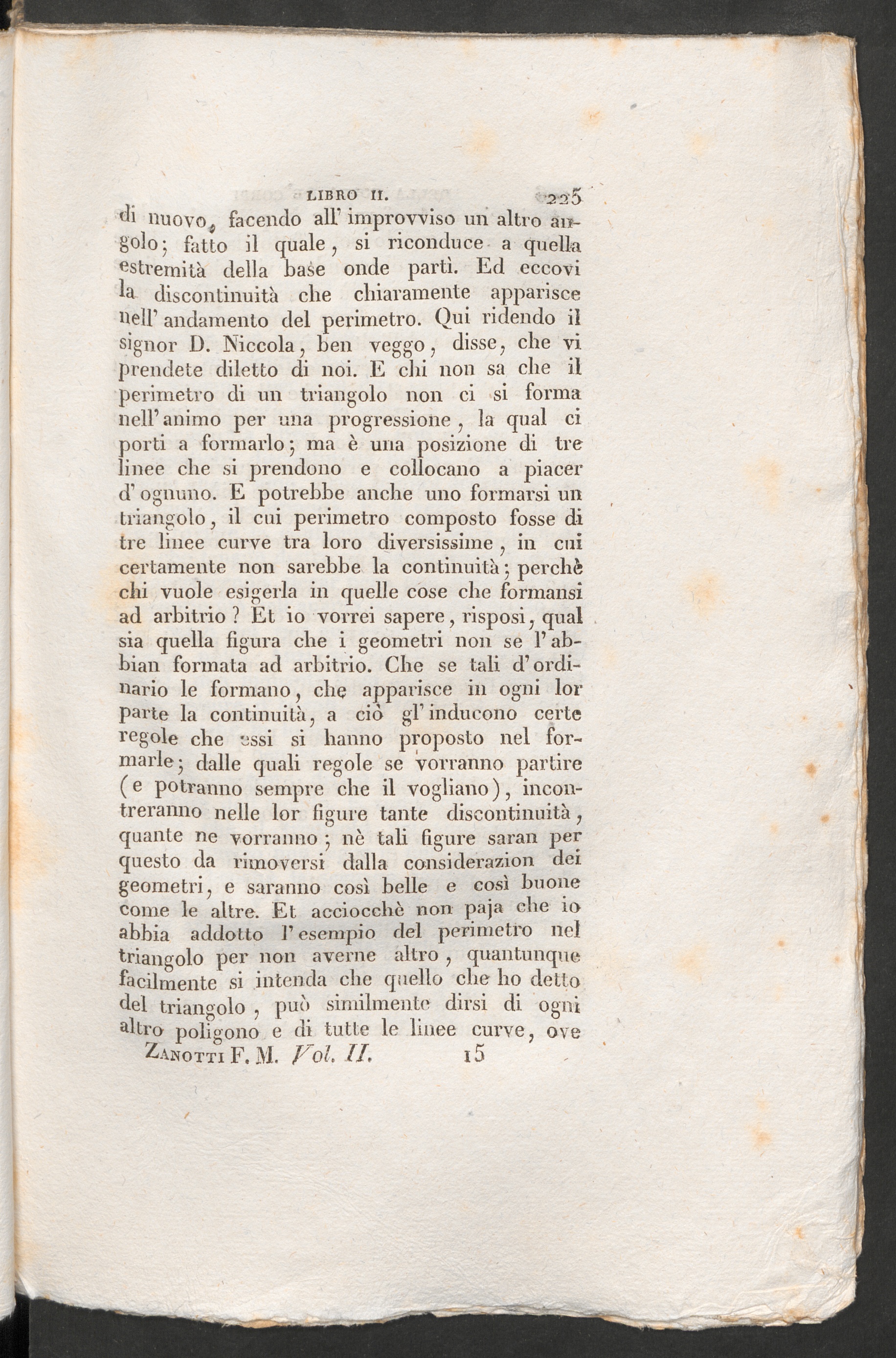 di nuovo t facendo all 1 improvviso un altro an-golo; fatto il quale, si riconduce a quellaestremità della base onde partì. Ed eccovidiscontinuità che chiaramente appariscenell’ andamento del perimetro. Qui ridendo ilsignor D. Niccola, ben veggo, disse, che viprendete diletto di noi. E chi non sa che ilperimetro di un triangolo non ci si formanell 1 animo per una progressione , la qual ciporti a formarlo 5 ma è una posizione di trelinee che si prendono e collocano a piacerd’ ognuno. E potrebbe anche uno formarsi untriangolo, il cui perimetro composto fosse ditre linee curve tra loro diversissime , in cuicertamente non sarebbe la continuità ; perchèchi vuole esigerla in quelle cose che formansiad arbitrio ? Et io vorrei sapere, risposi, qualsia quella figura che i geometri non se F ab-biali formata ad arbitrio. Che se tali d’ordi-uario le formano, che apparisce in ogni lorparte la continuità, a ciò gl’inducono certeregole che essi si hanno proposto nel for-marle 3 dalle quali regole se vorranno partire(e potranno sempre che il vogliano), incon-treranno nelle lor figure tante discontinuità,quante ne vorranno •, nè tali figure saran perquesto da rimoversi dalla considerazion deigeometri, e saranno così belle e così buonecome le altre. Et acciocché non paja che ioabbia addotto l’esempio del perimetro neltriangolo per non averne altro , quantunquefacilmente si intenda che quello che ho dettodel triangolo , può similmente dirsi di ognialtro poligono e di tutte le linee curve, oveZanottiF. M. Voi. IL i5