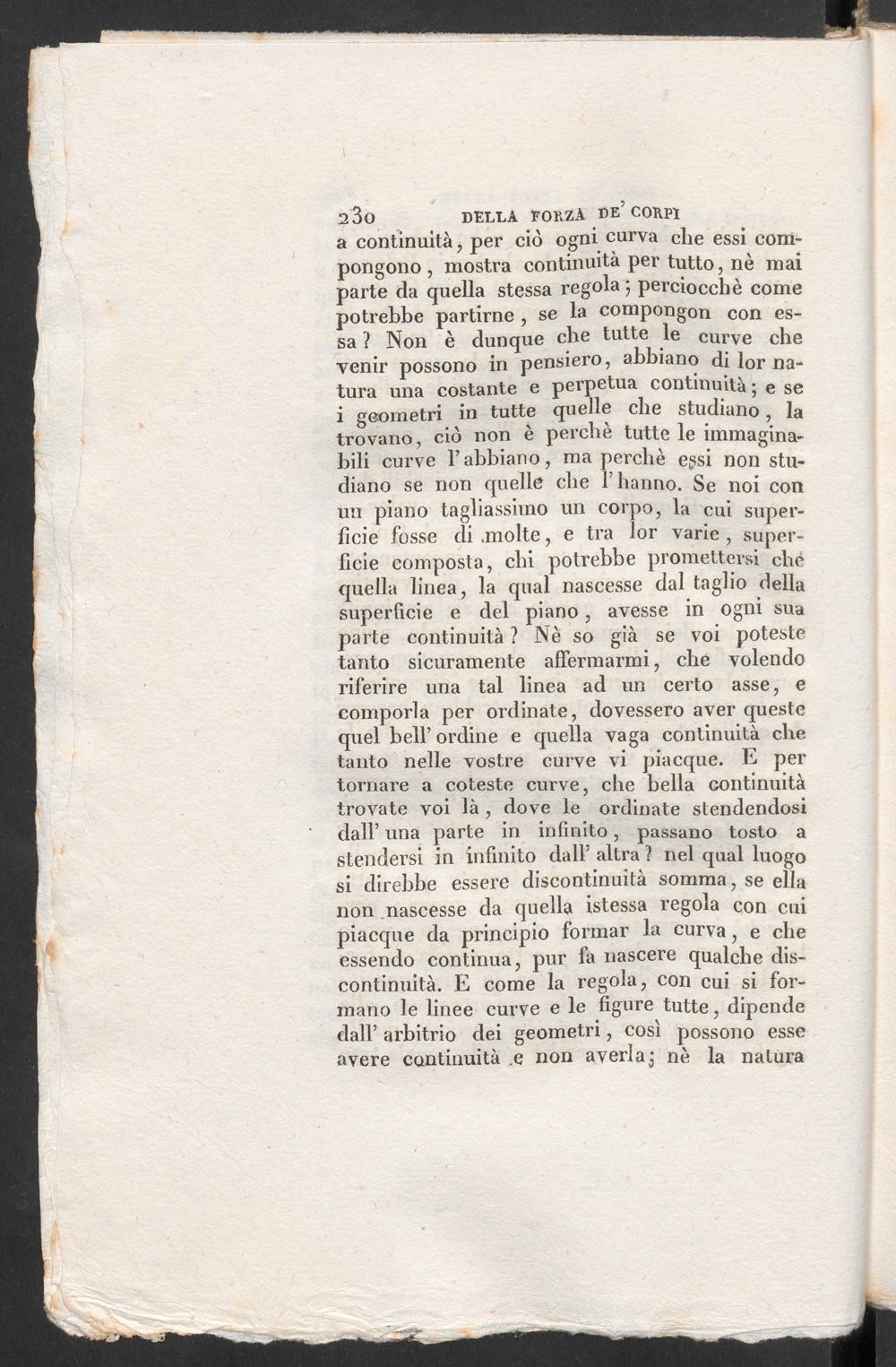 a continuità, per ciò ogni curva che essi com-pongono , mostra continuità per tutto, nè maiparte da quella stessa regola ; perciocché comepotrebbe partirne , se la compongon con es-sa ? Non è dunque che tutte le curve chevenir possono in pensiero, abbiano di lor na-tura una costante e perpetua continuità; e sei geometri in tutte quelle che studiano, latrovano, ciò non è pei’cliè tutte le immagina-bili curve l’abbiano, ma perchè egsi non stu-diano se non quelle che l’hanno. Se noi conun piano tagliassimo un corpo, la cui super-ficie fosse di .molte, e tra lor varie , super-ficie composta, chi potrebbe promettersi chequella linea, la qual nascesse dal taglio dellasuperficie e del piano, avesse in ogni suaparte continuità ? Nè so già se voi potestetanto sicuramente affermarmi, che volendoriferire una tal linea ad un certo asse, ecomporla per ordinate, dovessero aver questequel bell’ ordine e quella vaga continuità chetanto nelle vostre curve vi piacque. E pertornare a coleste curve, che bella continuitàtrovate voi là, dove le ordinate stendendosidall’ una parte in infinito, passano tosto astendersi in infinito dall’ altra ? nel qual luogosi direbbe essere discontinuità somma, se ellanon nascesse da quella istessa regola con cuipiacque da principio formar la curva, e cheessendo continua, pur fa nascere qualche dis-continuità. E come la regola, con cui si for-mano le linee curve e le figure tutte, dipendedall’ arbitrio dei geometri, così possono esseavere continuità e non averla; nè la natura