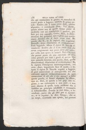 che qui cominciano le prove; et essendosi dinuovo posto a leggere, recitate le prime pa-role : Sembra che il buon senso detti, ridettealquanto, e sorridendo disse: Voi direte,questa essere una di quelle forme piene dimodestia con cui cominciano i paurosi, perfinir poi con orgoglio- Certo, dissi, le dimo-strazioni dei geometri non soglion così comin-ciarsi : Sembra che il buon senso detti. Maquesto die fa, se le ragioni die soggiungeBemulli, sieno chiarissime et evidentissime?Però leggetele. Allora il signor D. Piccola ri-cominciò: Sembra che il buon senso detti cheverun cangiamento non possa farsi per salto ;per salto non opera la natura. Non a ha cosache passar possa da una estremità all’ altrasenza passare per tutti i gradi di mezzo. Quinon potendo tenermi, son queste, dissi, quelledimostrazioni chiarissime et evidentissime ? Ma-la signora Principessa interrompendomi, voisiete, disse, impaziente fuor di modo; e in-tanto il signor D. Niccola seguitò a leggere.E qual connessione si concepirebbe tra dueestremità opposte indipendentemente da ogniconnessione di ciò che è tr'a mezzo? e lettequeste parole, si fermò alquanto. Io allora,non so, dissi, se questa a voi paja una ra-gione; a me certamente o non pare, o nonpare almeno di quella tanta evidenza che astabilire un principio infallibile e necessariosi richiederebbe. Avendo io così detto, e ta-cendomi , parve che gli altri pur si tacesse-ro ; et io seguitai : Io dico dunque, che seun corpo, scorrendo uno spazio, dee passare