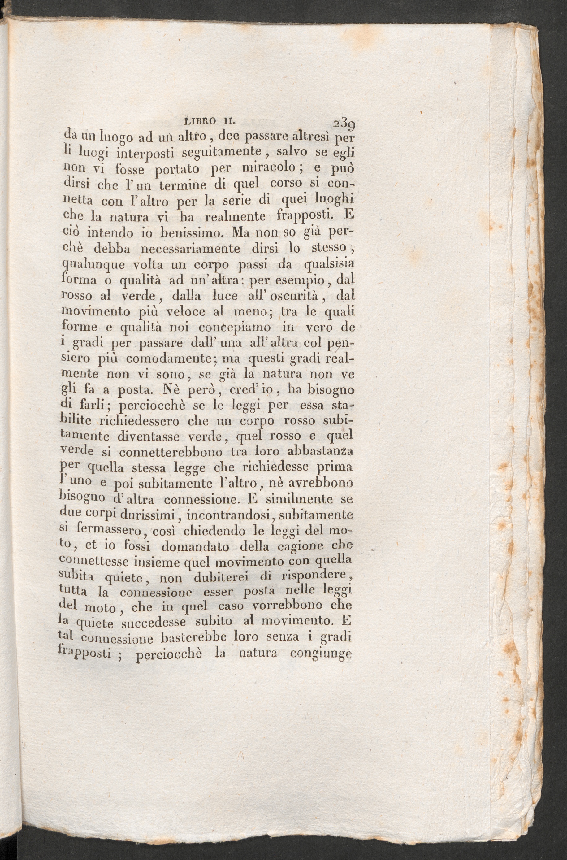 un luogo ad uù altfo , dee passare altresì perli luogi interposti seguitamente, salvo se eglinon vi fosse portato per miracolo ; e puòdirsi che F un termine di quel corso si con-netta con F altro per la serie di quei luoghic lie la natura vi ha realmente frapposti. Eciò intendo io benissimo. Ma non so già per-chè debba necessariamente dirsi lo stesso ,qualunque volta un corpo passi da qualsisialorma o qualità ad un’altra: per esempio, dalrosso al verde, dalla luce all’ oscurità, dalmovimento più veloce al meno; tra le qualiforme e qualità noi concepiamo in vero de* gradi per passare dall’ una all’ altra col pen-siero più comodamente; ma questi gradi real-mente non vi sono, se già la natura non vegli fa a posta. Nè però, cred’io, ha bisognodi farli; perciocché se le leggi per essa sta-bilite richiedessero che un corpo rosso subi-tamente diventasse verde, quel rosso e quelver de si connetterebbono tra loro abbastanza
