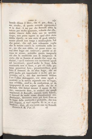 laonde chiuso il libro , che vi par, disse, ame rivolto, di questo secondo argomento?et io dissi : A me par che Bernulli abbia lanatura per molto ignorante, volendo che ella,qualor rimove dallo stato suo un qualchecorpo, non possa sapere in qual altro statodebba riporlo , se una serie di gradi infinita-mente piccoli non venga a mostrargliele. Nelche parmi, che egli non solamente vogliache la natura osservi la continuità nelle co-se , ma che non abbia, nè possa avere ve-rmi’ altra legge cui osservare ; perchè se al-cuna ne avesse, potrebbe questa insegnarleciò che la continuità non le insegnasse. Ecerto che se fossero al mondo due corpi du-rissimi , i quali venissero con movimenti egualiad incontrarsi, quand’anche la legge dellacontinuità non vi fosse, e per ciò nulla po-tesse prescriver loro, prescriverebbesi peròloro il fermarsi da un’ altra legge, che mipare molto più importante e molto più ne-cessaria ; ed è, che due movimenti debbanl’un 1’ altro distruggersi, ove sieno eguali econtrarj : e la natura seguendo una tal legge,non avrebbe, cred’io, da confondersi, nè daVergognarsi di non sapere quello che far sidovesse. Qui fattosi innanzi il signor D. Se-rao , veramente disse, io credeva che quegliSgomenti di Bernulli, essendo tanto famosi,e ricevuti da molti come dimostrazioni evi-dentissime, dovessero esser più forti. Pure sela legge della continuità è probabile, che nonpuò negarsi, si vuol seguirla. Et io, se si at-tendano , dissi, gli argomenti con cui BernulliCanotti F. M. FqI. IL 16