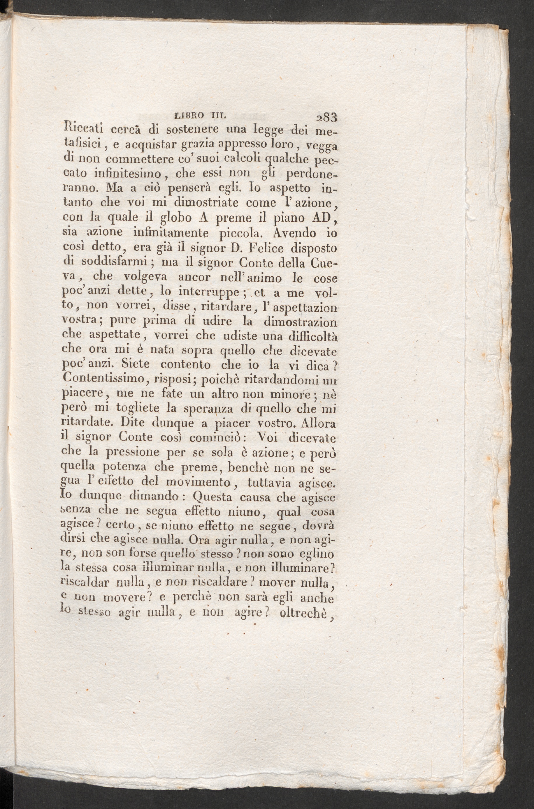 Riceati cerca di sostenere una legge dei me-tafisici , e acquistar grazia appresso loro , veggadi non commettere co’ suoi calcoli qualche pec-cato infinitesimo, che essi non gli perdone-ranno. Ma a ciò penserà egli, lo aspetto in-tanto che voi mi dimostriate coinè l’azione,con la quale il globo A preme il piano AD ,sia azione infinitamente piccola. Avendo iocosì detto, era già il signor D. Felice dispostodi soddisfarmi ; ma il signor Conte della Cue-va, che volgeva ancor nell’animo le cosepoc’anzi dette, lo interruppe ; et a me vol-to, non vorrei, disse , ritardare, 1’aspettazionvostra; pure prima di udire la dimostrazionche aspettate, vorrei che udiste una difficoltàche ora mi è nata sopra quello che dicevatepoc’ anzi. Siete contento che io la vi dica ?Contentissimo, risposi; poiché ritardandomi unpiacere, me ne fate un altro non minore ; néperò mi togliete la speranza di quello che miritardate. Dite dunque a piacer vostro. Allorail signor Conte così cominciò: Voi dicevateche la pressione per se sola è azione ; e peròquella potenza che preme, benché non ne se-gua l’eifetto del movimento , tuttavia agisce.Io dunque dimando : Questa causa che agiscesenza che ne segua effetto niuno, qual cosaagisce? certo, se niuno effetto ne segue, dovràdirsi che agisce nulla. Ora agir nulla, e non agi-re, non son forse quello' stesso ? non sono eglinola stessa cosa illuminar nulla, e non illuminare?riscaldar nulla, e non riscaldare ? mover nulla,e non movere? e perché uon sarà egli anchelo stesso agir nulla, e lion agire? oltreché,
