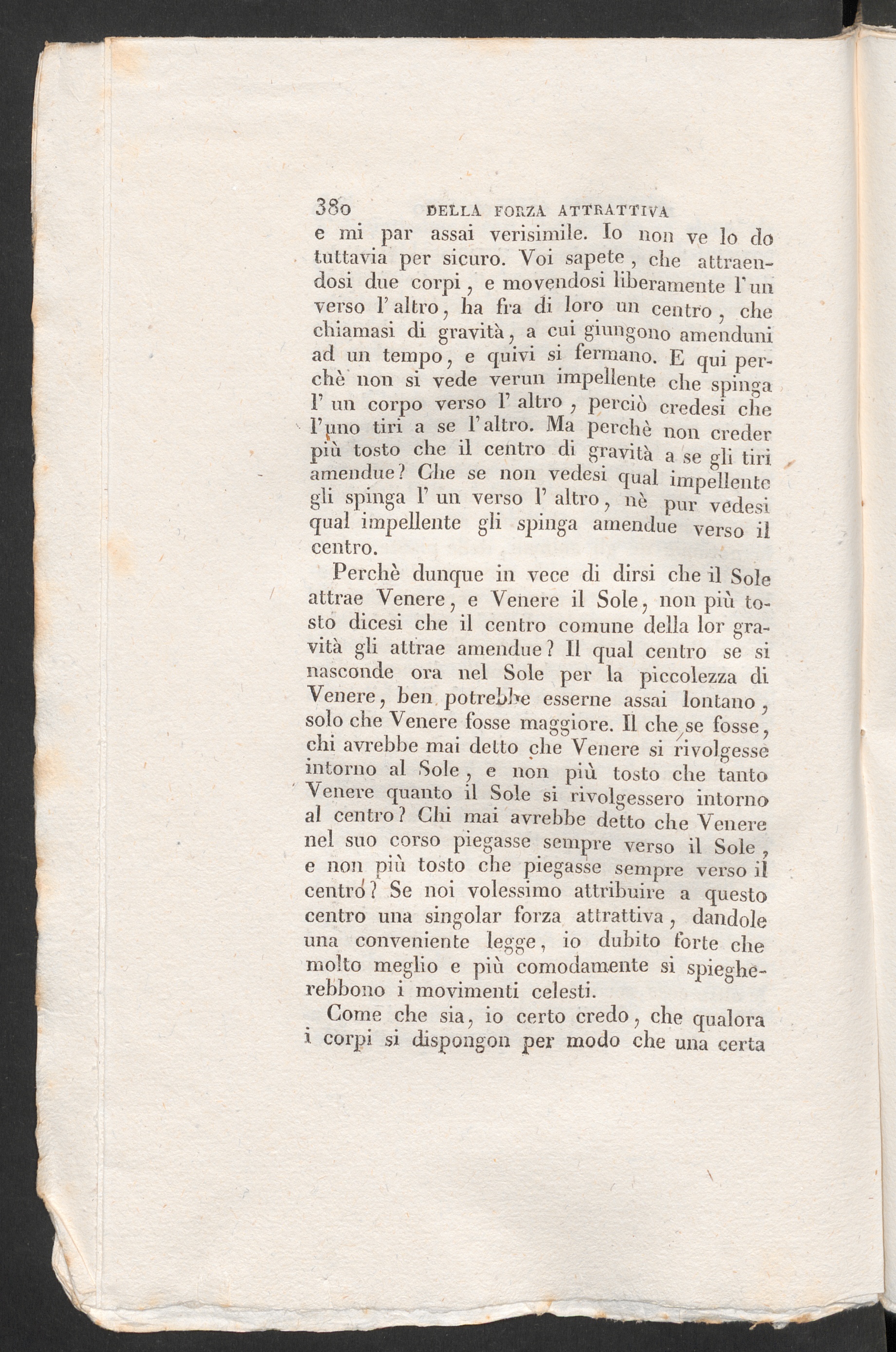 Perchè dunque in vece di dirsi che il Soleattrae Venere, e Venere il Sole, non più to-sto dicesi che il centro comune della lor gra-vità gli attrae amendue ? 11 qual centro se sinasconde ora nel Sole per la piccolezza diVenere, ben potrebbe esserne assai lontano,solo che Venere fosse maggiore. Il che / se fosse,chi avrebbe mai detto che Venere si rivolgesseintorno al Sole , e non più tosto che tantoVenere quanto il Sole si rivolgessero intornoal centro ? Chi mai avrebbe detto che Venerenel suo corso piegasse sempre verso il Sole ,e non più tosto che piegasse sempre verso ilcentro? Se noi volessimo attribuire a questocentro una singoiar forza attrattiva , dandoleuna conveniente legge, io dubito forte chemolto meglio e più comodamente si spieghe-rebbono i movimenti celesti.