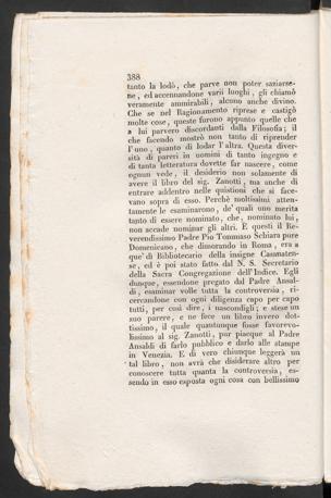 tanto la lodò, che parve non poter saziarse-ne , ed accennandone varii luoghi, gli chiamòveramente ammirabili, alcuno anche divino.Che se nel Ragionamento riprese e castigòmolte cose, queste furono appunto quelle chea lui parvero discordanti dalla Filosofia 3 ilche facendo mostrò non tanto di riprenderl’uno , quanto di lodar 1’ altra. Questa diver-sità di pareri in uomini di tanto ingegno edi tanta letteratura dovette far nascere, comeognun vede, il desiderio non solamente diavere il libro del sig. Zanotti, ma anche dientrare addentro nelle quistioni che si face-vano sopra di esso. Perchè moltissimi atten-tamente le esaminarono, de’ quali uno meritatanto di essere nominato, che, nominato lui ynon accade nominar gli altri. E questi il Re-verendissimo Padre Pio Tommaso Schiara pureDomenicano, che dimorando in Roma , era aque’ dì Bibliotecario della insigne Casanaten-se, ed è poi stato fatto dal N. S. Secretanodella Sacra Congregazione dell’Indice. Eglidunque, essendone pregato dal Padre Arnal-di , esaminar volle tutta la controversia, ri-cercandone con ogni diligenza capo per capotutti, per così dire, i nascondigli; e stesemisuo parere, e ne fece un libro invero dot-tissimo, il quale quantunque fosse favorevo-lissimo al sig. Zanotti , pur piacque al PadreAnsaldi di farlo pubblico e darlo alle stampein Venezia . E di vero chiunque leg gerà un* tal libro, non avrà che disidevare altro perconoscere tutta quanta la controversia, es-sendo in esso esposta ogni cosa con bellissimo