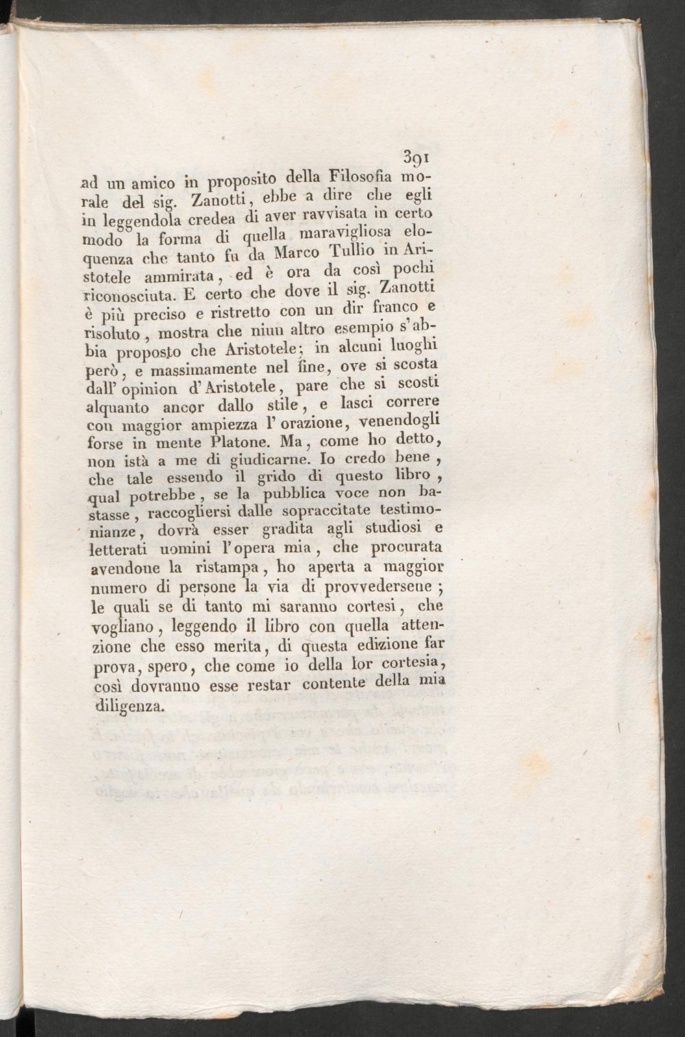 ad un amico in proposito della Filosofia mo-rale del sig. Zanotti, ebbe a dire cbe egliin leggendola credea di aver ravvisata in certomodo la forma di quella maravigliosa elo-quenza che tanto fu da Marco Tullio ^ in Ari-stotele ammirata, ed è ora da cosi pochiriconosciuta. E certo che dove il sig. Zanottiè più preciso e ristretto con un dir franco erisoluto , mostra che niun altro esempio s’ab-bia proposto che Aristotele ; in alcuni luoghiperò , e massimamente nel line, ove si scostadall’ opinion d’Aristotele , pare che si scostialquanto ancor dallo stile, e lasci correrecon maggior ampiezza 1’ orazione, venendogliforse in mente Platone . Ma, come ho detto,non istà a me di giudicarne. Io credo bene ,che tale essendo il grido di questo libro ,qual potrebbe , se la pubblica voce non ba-stasse , raccogliersi dalle sopraccitate testimo-nianze , dovrà esser gradita agli studiosi eletterati uomini l’opera mia, che procurataavendone la ristampa , ho aperta a maggiornumero di persone la via di provvedersene ;le quali se di tanto mi saranno cortesi, chevogliano, leggendo il libro con quella atten-zione che esso merita, di questa edizione farprova, spero, che come io della lor cortesia,così dovranno esse restar contente della miadiligenza.