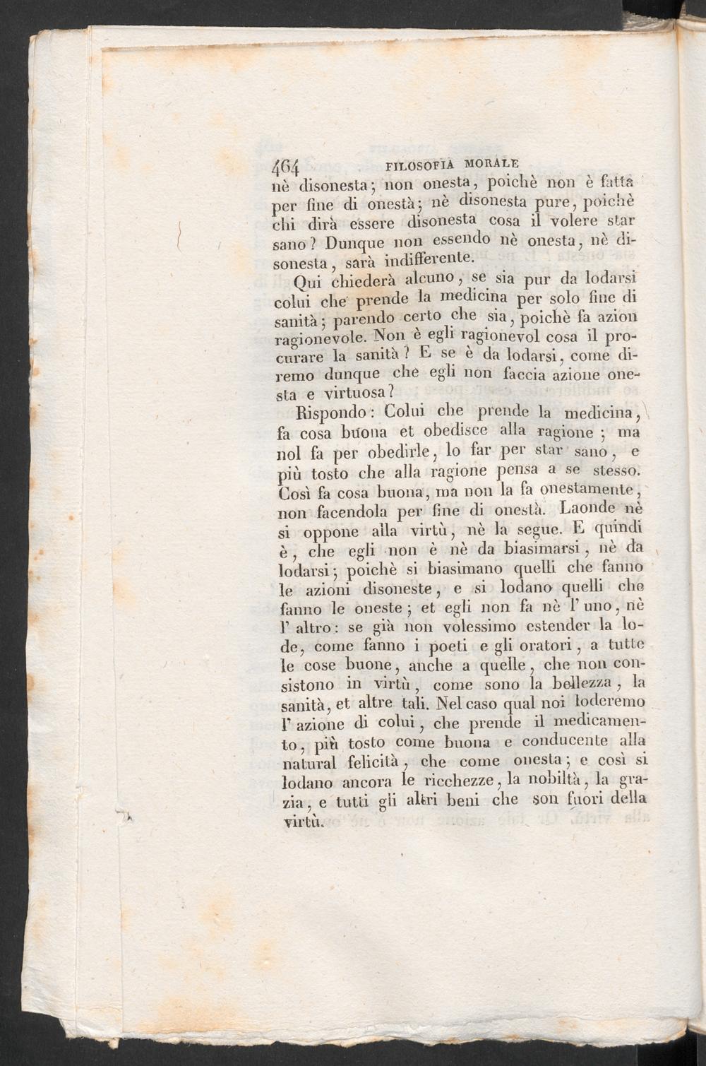 Qui chiederà alcuno, se sia pur da lodarsicolui che prende la medicina per solo fine disanità5 parendo certo che sia, poiché fa azionragionevole. Non è egli ragionevol cosa il pro-curare la sanità ? E se e da lodarsi, come di-remo dunque che egli non faccia azione one-sta e virtuosa?