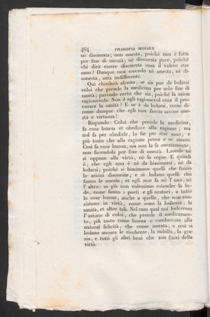 Rispondo: Colui che prende la medicina,fa cosa buona et obedisce alla ragione ; manoi fa per obedirle, lo far per star sano, epiù tosto che alla ragione pensa a se stesso.Così fa cosa buona, ma non la fa onestamente,non facendola per fine di onestà. Laonde nèsi oppone alla virtù, nè la segue. E quindiè, che egli non è nè da biasimarsi, nè dalodarsi 5 poiché si biasimano quelli che fannole azioni disoneste, e si lodano quelli chefanno le oneste ; et egli non fa nè f uno, nèf altro : se già non volessimo estender la lo-de, come fanno i poeti e gli oratori, a tuttele cose buone, anche a quelle, che non con-sistono in virtù, come sono la bellezza, lasanità, et altre tali. Nel caso qual noi loderemo1’ azione di colui, che prende il medicamen-to , più tosto come buona e conducente allanaturai felicità, che come onesta} e così silodano ancora le ricchezze, la nobiltà, la gra-zia, e tutti gli altri beni che son fuori dellavirtù.