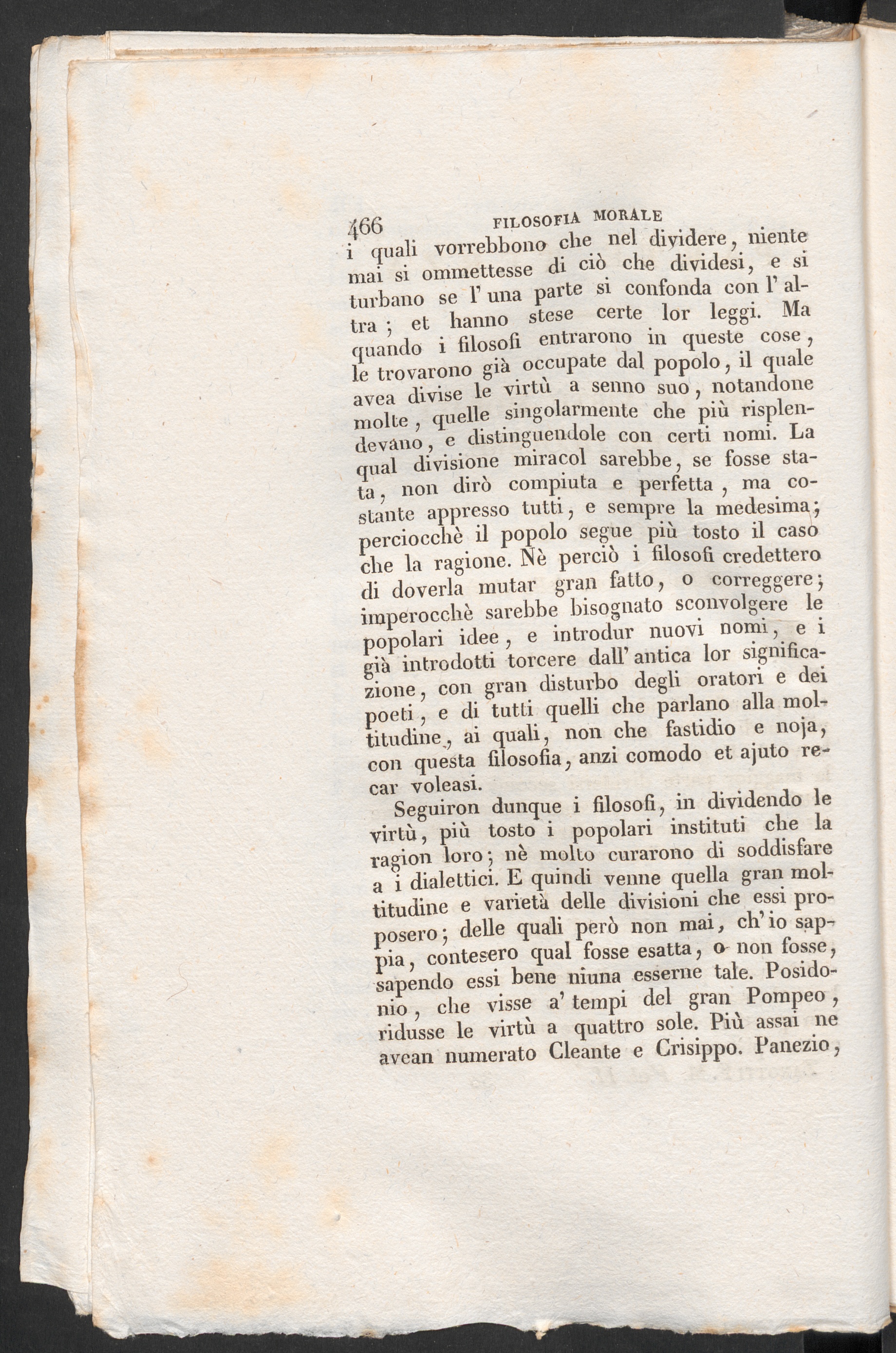Seguiron dunque i filosofi, in dividendo levirtù, più tosto i popolari instituti che laragion loro-, nè molto curarono di soddisfarea i dialettici. E quindi venne quella gran mol-titudine e varietà delle divisioni che essi pro-posero ; delle quali però non mai, ch’io sap-pia, contesero qual fosse esatta, o non fosse,sapendo essi bene niuna esserne tale. Posido-nio, che visse a’ tempi del gran Pompeo ,ridusse le virtù a quattro sole. Più assai neavean numerato Cleante e Crisippo . Panezio ,