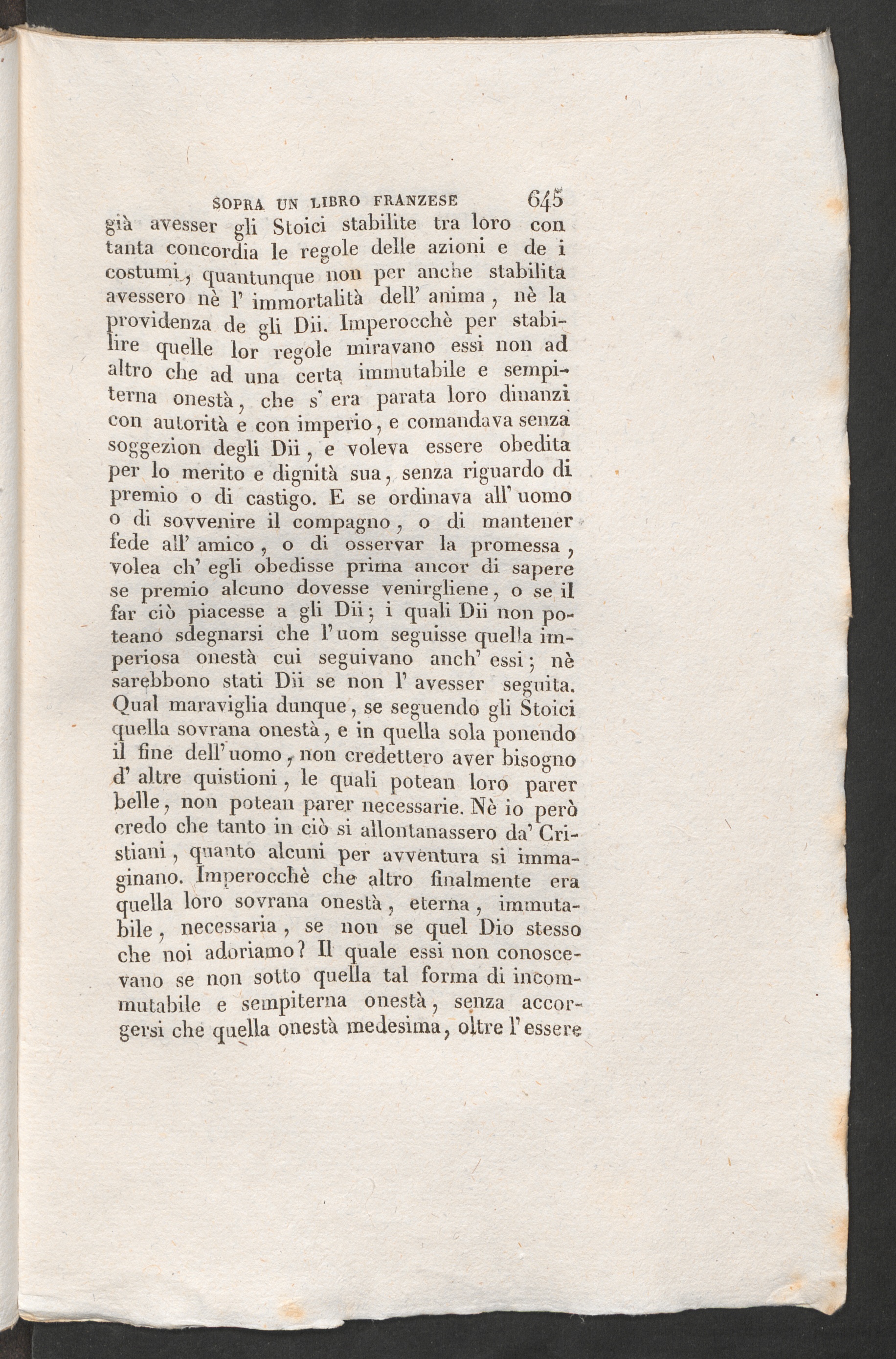 già avesser gli Stoici stabilite tra loro con.tanta concordia le regole delle azioni e de icostumi , quantunque non per anche stabilitaavessero nè 1’ immortalità dell’ anima , nè laprovidenza de gli Dii. Imperocché per stabi-lire quelle lor regole miravano essi non adaltro clic ad una certa immutabile e sempi-*terna onestà, che s era parata loro dinanzicon autorità e con imperio, e comandava senzasoggezion degli Dii, e voleva essere obeditaper lo merito e dignità sua, senza riguardo dipremio o di castigo. E se ordinava all 1 uomoo di sovvenire il compagno, o di mantenerlede all’ amico , o di osservar la promessa ,volea eh’ egli obedisse prima ancor di saperese premio alcuno dovesse venirgliene, o se ilfar ciò piacesse a gli Dii : i quali Dii non po-teano sdegnarsi che F uom seguisse quella im-periosa onestà cui seguivano aneli 1 essi ; nèsarebbono stati Dii se non l 1 avesser seguita.Qual maraviglia dunque, se seguendo gli Stoiciquella sovrana onestà, e in quella sola ponendoil fine dell 1 uomo, non credettero aver bisognod 1 altre quistioni, le quali potean loro parerbelle, non potean parer necessarie. Nè io peròcredo che tanto in ciò si allontanassero da 1 Cri-stiani , quanto alcuni per avventura si imma-ginano. Imperocché che altro finalmente eraquella loro sovrana onestà, eterna , immuta-bile , necessaria , se non se quel Dio stessoche noi adoriamo ? Il quale essi non conosce-vano se non sotto quella tal forma di incom-mutabile e sempiterna onestà, senza accor-gersi che quella onestà medesima, oltre l’essere