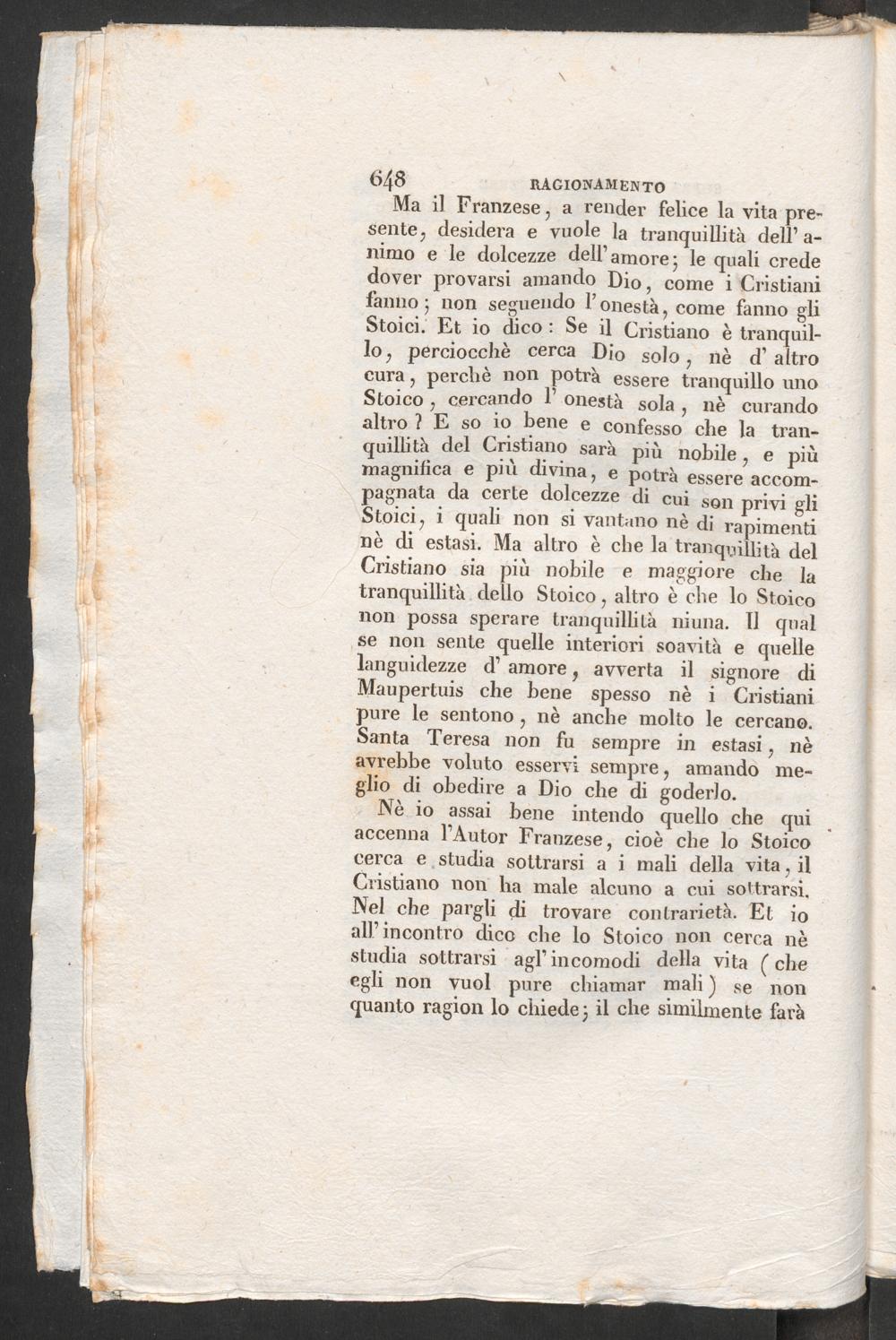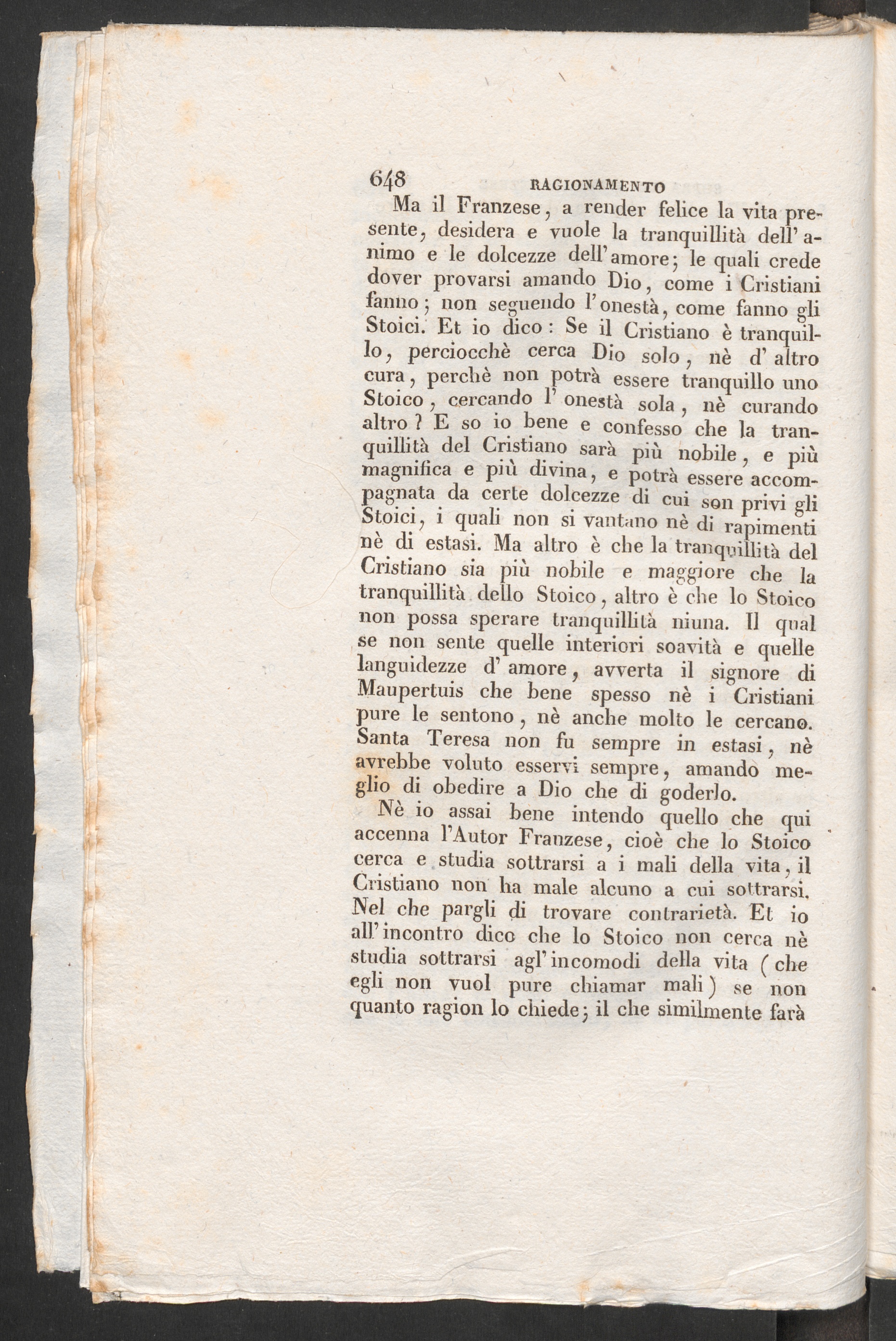 Ma il Franzese, a rendei’ felice la vita pre-sente, desidera e vuole la tranquillità dell 1 a-nimo e le dolcezze dell 1 amore ; le quali crededover provarsi amando Dio , come i Cristianifanno; non seguendo l’onestà, come fanno gliStoici. Et io dico : Se il Cristiano è tranquil-lo, perciocché cerca Dio solo, nè d’altrocura, perché non potrà essere tranquillo unoStoico , cercando l 1 onestà sola , nè curandoaltro ? E so io bene e confesso che la tran-quillità del Cristiano sarà pm nobile, e piùmagnifica e piu divina, e potrà essere accom-pagnata da certe dolcezze di cui son privi gliStoici, i quali non si vantano nè di rapimentinè di estasi. Ma altro è che la tranquillità delCristiano sia più nobile e maggiore che latranquillità dello Stoico , altro è che lo Stoico non possa sperare tranquillità ninna. Il qualse non sente quelle interiori soavità e quellelanguidezze d 1 amore, avverta il signore diMaupertuis che bene spesso nè i Cristianipure le sentono, nè anche molto le cercano.Santa Teresa non fu sempre in estasi, nèavrebbe voluto esservi sempre, amando me-glio di obedire a Dio che di goderlo.