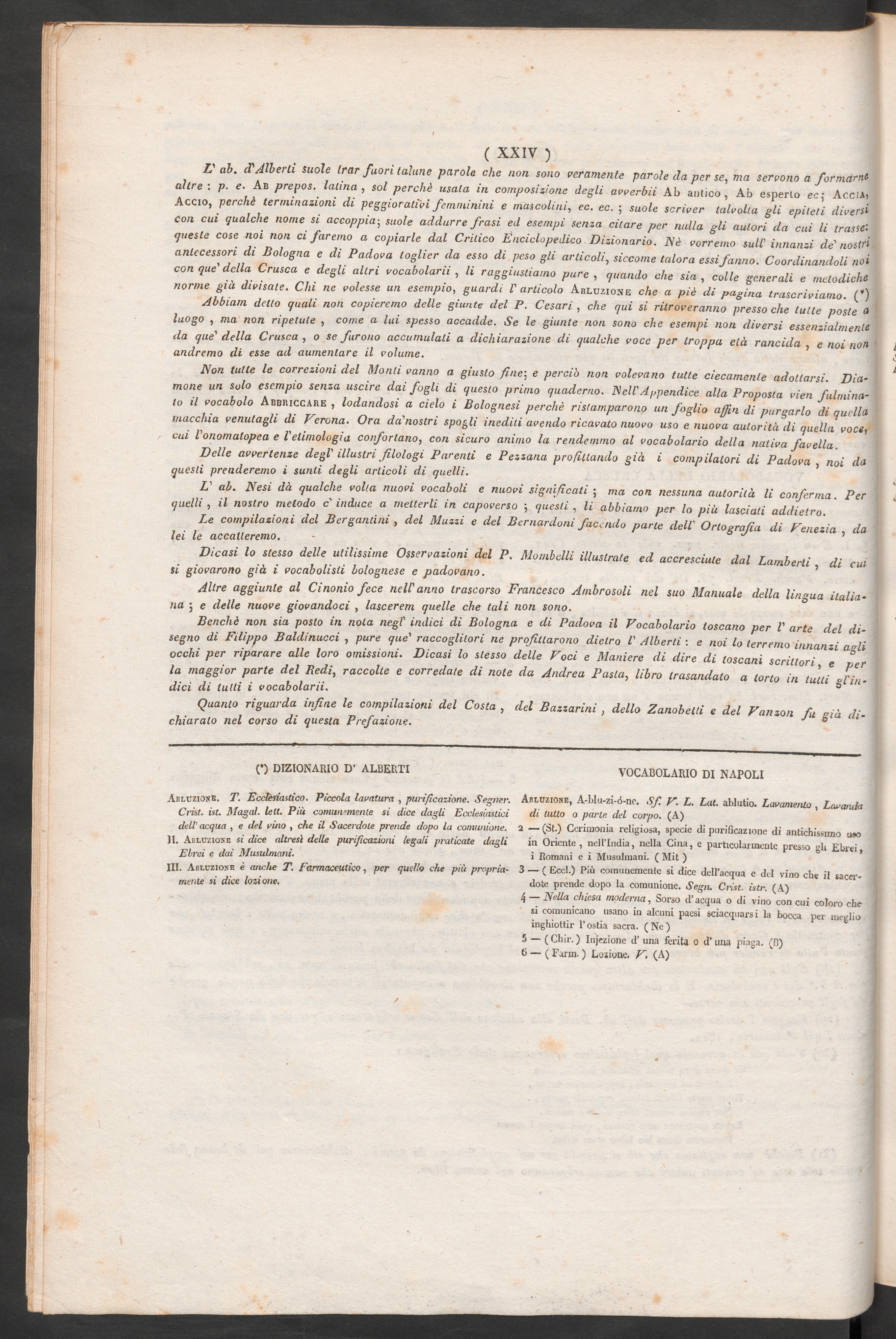 IL ab. di'Alberti suole trar fuori talune parola che non sono veramente parole da per se, ma servono a formarnealtre', p■ e. Ab prepos. Ialina, sol perchè usata in composizione degli avverbii Ab antico, Ab esperto ec; AcciiiAccio, perchè terminazioni di peggiorativi femminini e mascolini, ec. ec. ; suole scriver talvolta gli epiteti diversicon cui gualche nome si accoppia ; suole addurre frasi ed esempi senza citare per nulla gli autori da cui li trasse'-queste cose noi non ci faremo a copiarle dal Critico Enciclopedico Dizionario. Nè vorremo sull' innanzi de' nostriantecessori di Bologna e di Padova toglier da esso di peso gli articoli, siccome talora essi fanno. Coordinandoli noicon que' della Crusca e degli altri vocabolarii , li raggiustiamo pure , quando che sia , colle generali e melodichenorme già divisate. Chi ne volesse un esempio, guardi V articolo Abluzione che a piè di pagina trascriviamo. (*)