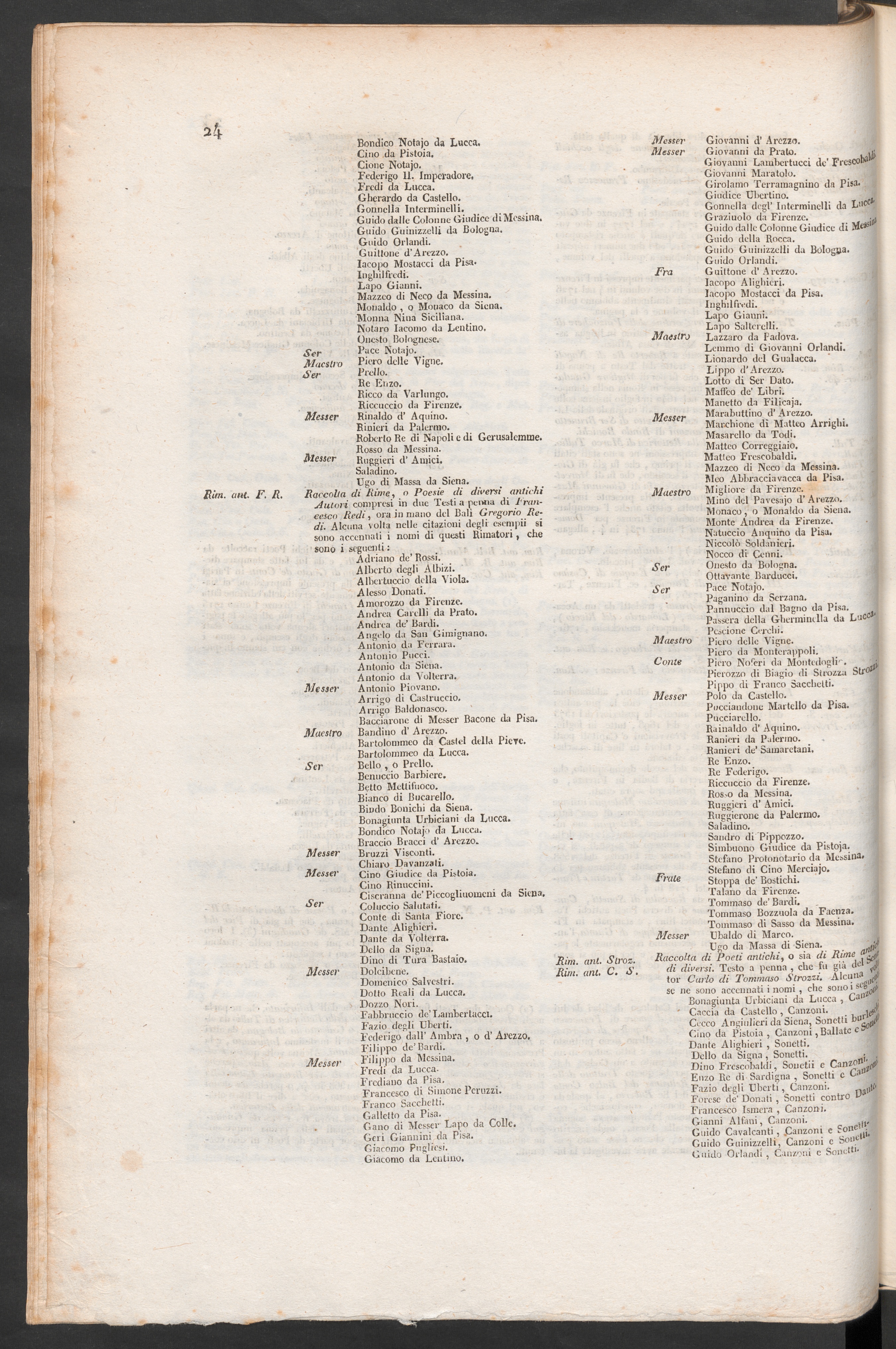 Raccolta di Rime, o Poesie di diversi antichiAutori compresi in due Testi a pernia di Fran cesco Redi , ora in mano del Bali Gregorio Re-di. Alcuna volta nelle citazioni degli esempli sisono accennati i nomi di questi Rimatori, chesono i seguenti :