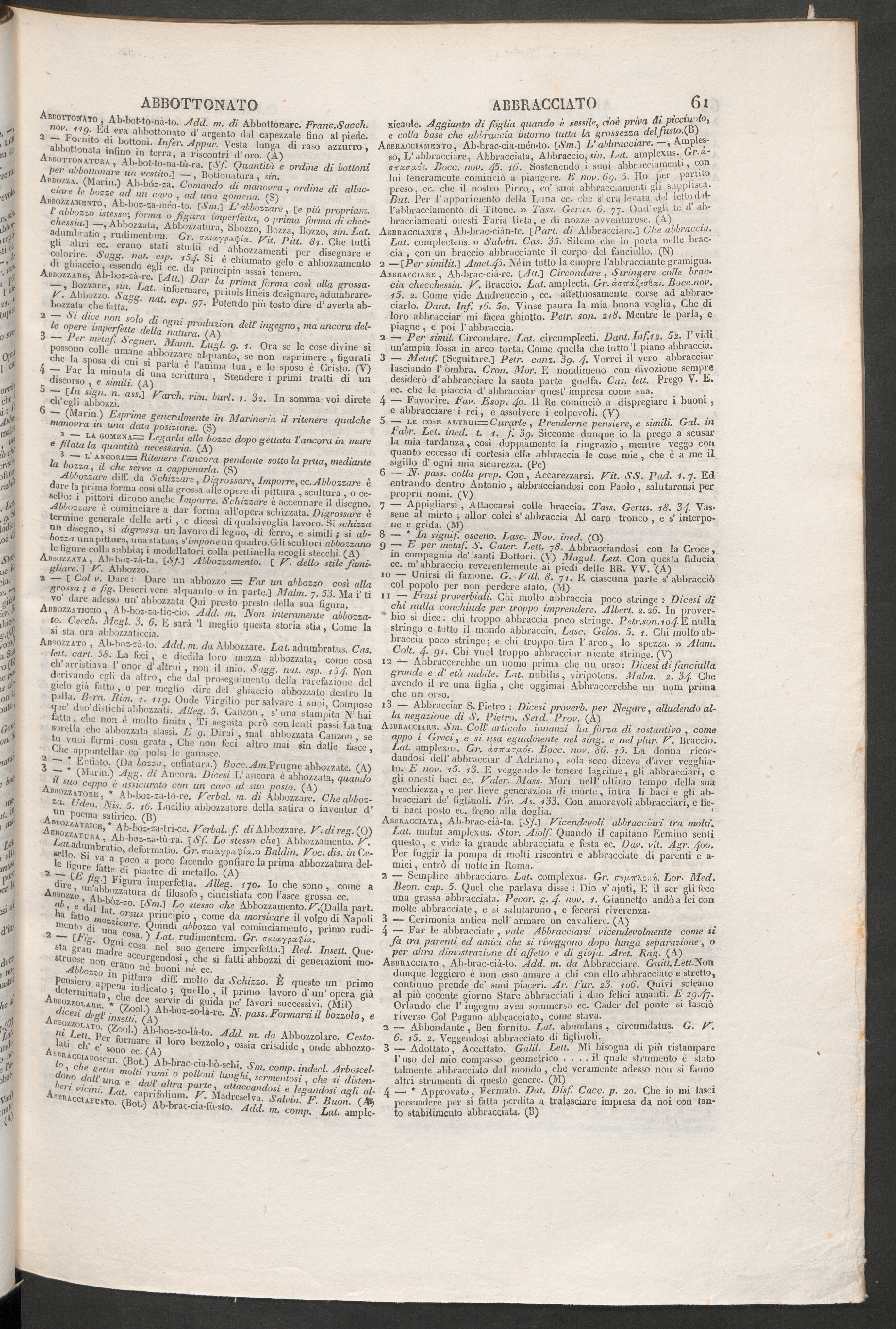 Abbracciare. Sm. Coll’ articolo innanzi ha forza di sostantivo , comeappo i Greci , e si usa egualmente nel sing. e nel plur. Braccio.Lat. amplcKtis. Gr. deTr^7fj.ós. Foce. nov. 86. i 3 . La donna ricor-dandosi dell’abbracciar d* Adriano, sola seco diceva d’aver vegghiu-to. E nov. i 5 . i 3 . E veggendo le tenere lagrime, gli abbracciar!, egii onesti baci ec. Valer. Mass. Morì nell’ ultimo tempo della suavecchiezza, e per lieve gcncrazion di morto , inira li baci e gli ab-bracciala de’ figlinoli. Eir. As. 1Ó3. Con. amorevoli abbracciaci, e lie-ti baci posto et. freno alla doglia. ‘
