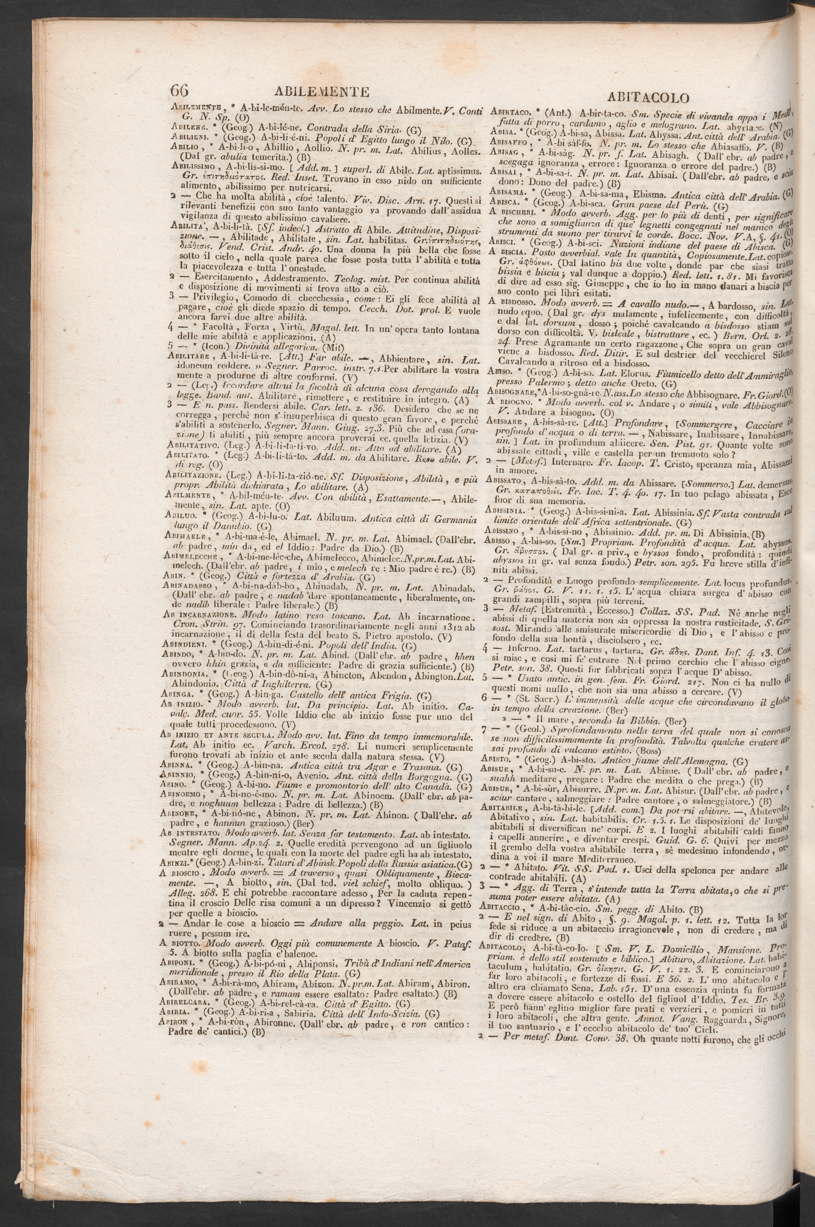 Abisur, * A-bi-sùr, Abisnrrc. N.pr. m. Lat. Abisur. (Dall’ebr. ab padre »sciur cantare , salmeggiare : padre cantore ,0 sahneggialore.) (B)Abitari le , A-bi-tà-bi-Ie. [Add. coni.] Da potarsi abitare. —, AbitevcP’Abitativo, sin. Lat. habitahUis. Cr. t. 5 . 1. Le disposizioni de’ luog’ 1abitabili si divcrsifican ne’ corpi. E 2. I luoghi abitabili caldi ft 0 * 1i cajx’IIi annerire , e diventar crespi. Guid. G. 6. Quivi per me^il grembo della vostra abitabile terra, se medesimo infonaendo,dina a voi il mare Mediterraneo. ..