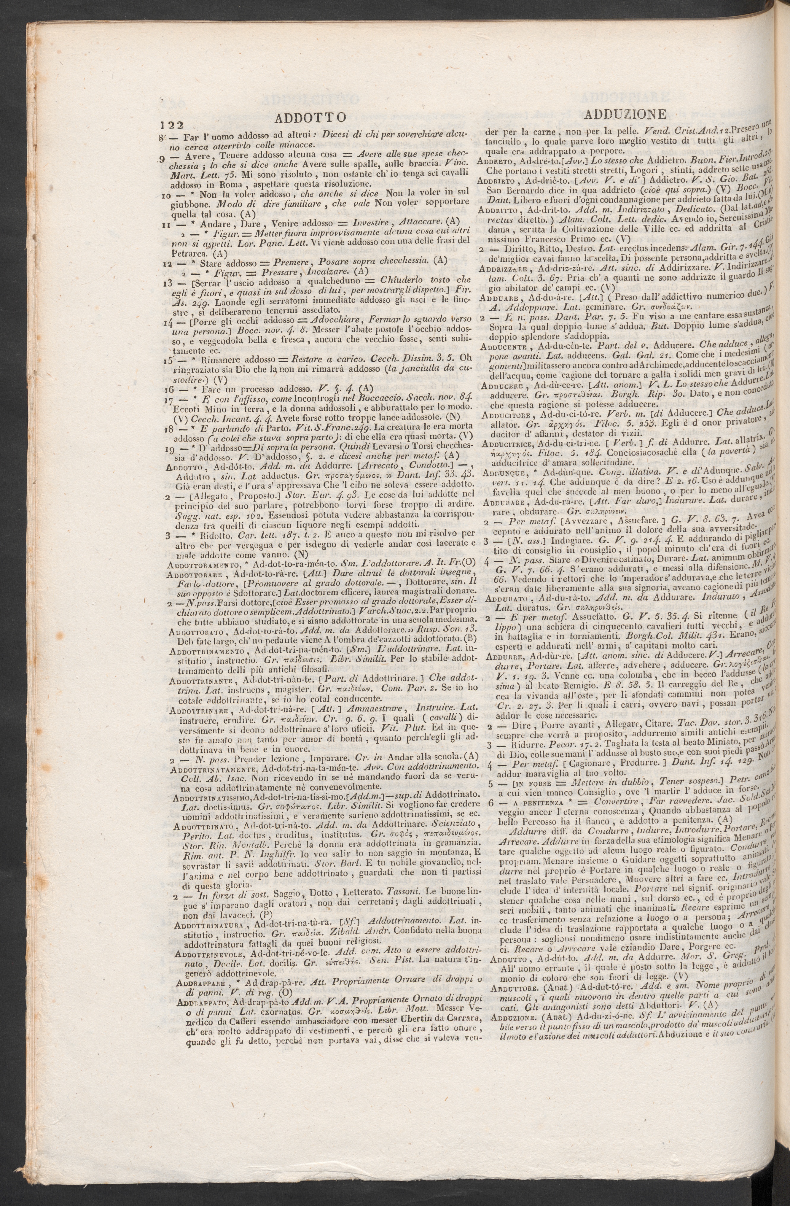 Deh fate largo, eh’ un pedante viene A l’ombra de’cazzotti addottorato. (B)Addottrinamento, Ad-dot-tri-na-mén-to. [iVm.] L’addottrinare. Lat.in-siitutio, instructio. Gr. 'iroclhviris. Libr. Similit. Per Io stabile* addot-trinamento deili più antichi Glosafì.