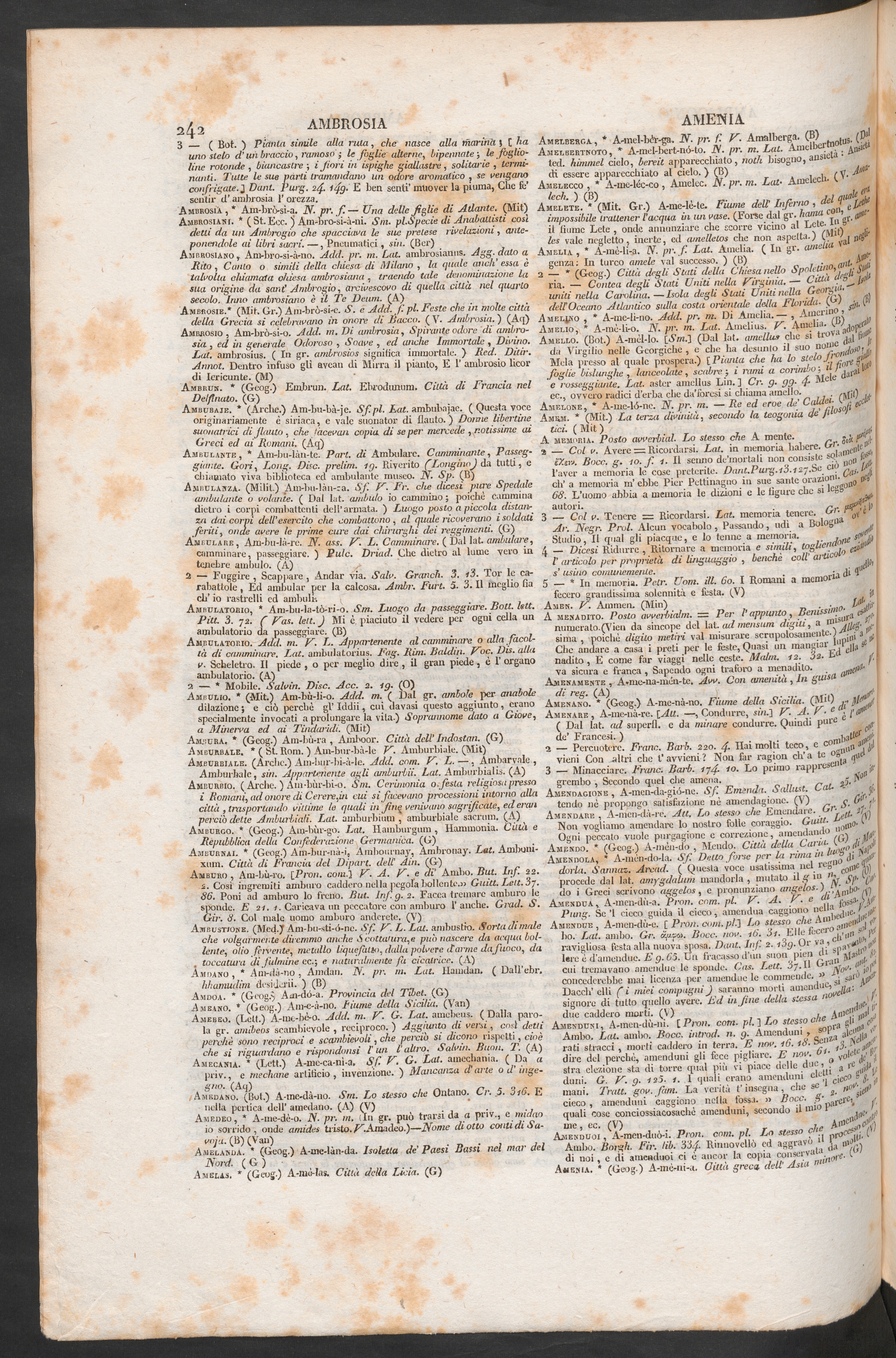 Ambrosie.* (Mit. Gr.) Am-brò-si-c. S. e Add. fi. pi. Feste che in molte cittàdella Grecia si celebravano in onore di linceo. ( V. Ambrosia. ) (Aq)Ambrosio , Àm-brò-si-o. Add. m. Di ambrosia , Spirante odore di ambro-sia , ed in generale Odoroso , Soave , ed anche Immortale , Divino.Lat. amhrosins. ( In gr. amlrosios significa immortale. ) Red. Ditir.Annoi. Dentro infuso gli avean di Mirra il pianto, E V ambrosio licordi Iericunte. (M)