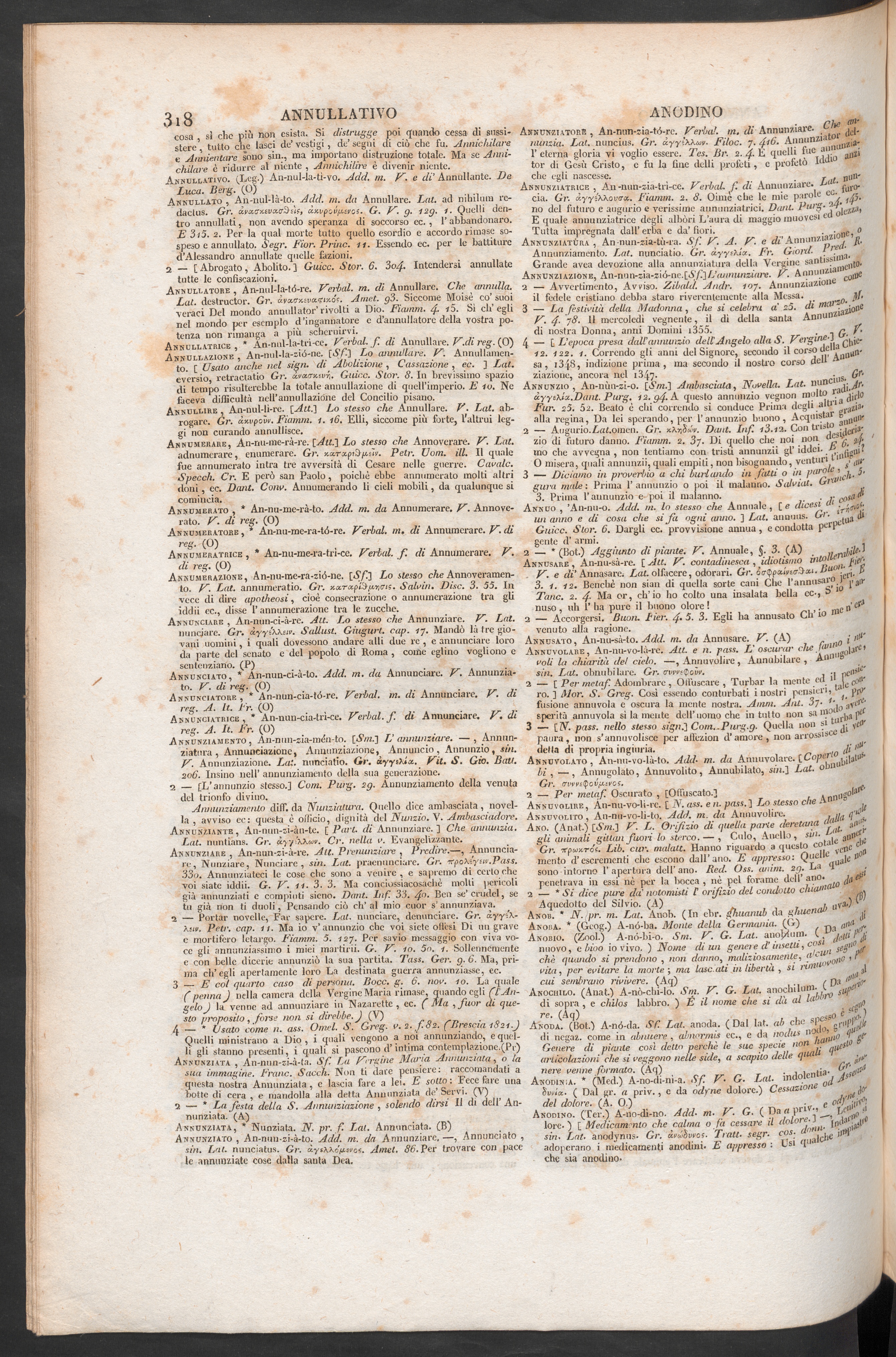 Annunziato, An-nunzi-à-to. Add. m. da Annunziare.—, Annunciato ,sin. Lai. nunciatus. Gr. àysAAoVsros. Amet. 86. Per trovare con pacele annunziate cose dalla santa Dea.