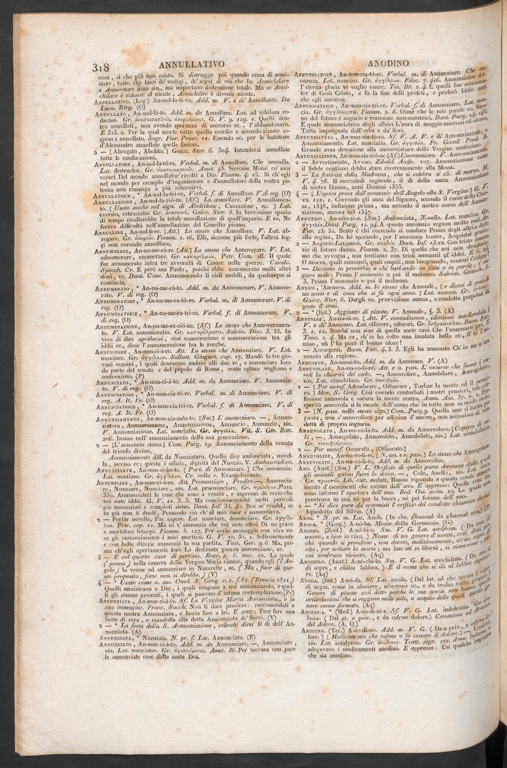 Annunziare , An-nun-si-à-re. Alt. Prenunziare , Predire .—, Annuncia-re, Nunziare, Nunciare, sin. Lai. praenunciure. Gr. fpo\tym.Pass.33o. Annunziateci le cose che sono a venire , e sapremo di certo chevoi siate iddìi. G. V. 11. 3 . 3 . Ma conciossiacosaché molti pericoligià annunziati e compiuti sieno. Dant. Inf. 33 . 4 n - Ben se ’ unnici, setu già non ti duoli, Pensando ciò eh’ al mio cuor s' annunziava.