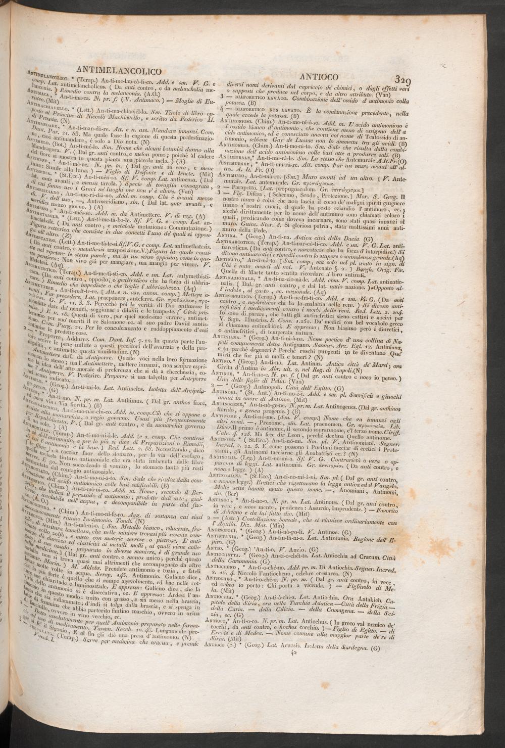 Antiko. * (Geog.) An-tì-no. Lat. Antinas. Antica città de’ Alarsi j omCivita d’Aldina in Abr. uh. 2. nel Jleg . di Nupoli.fN)
