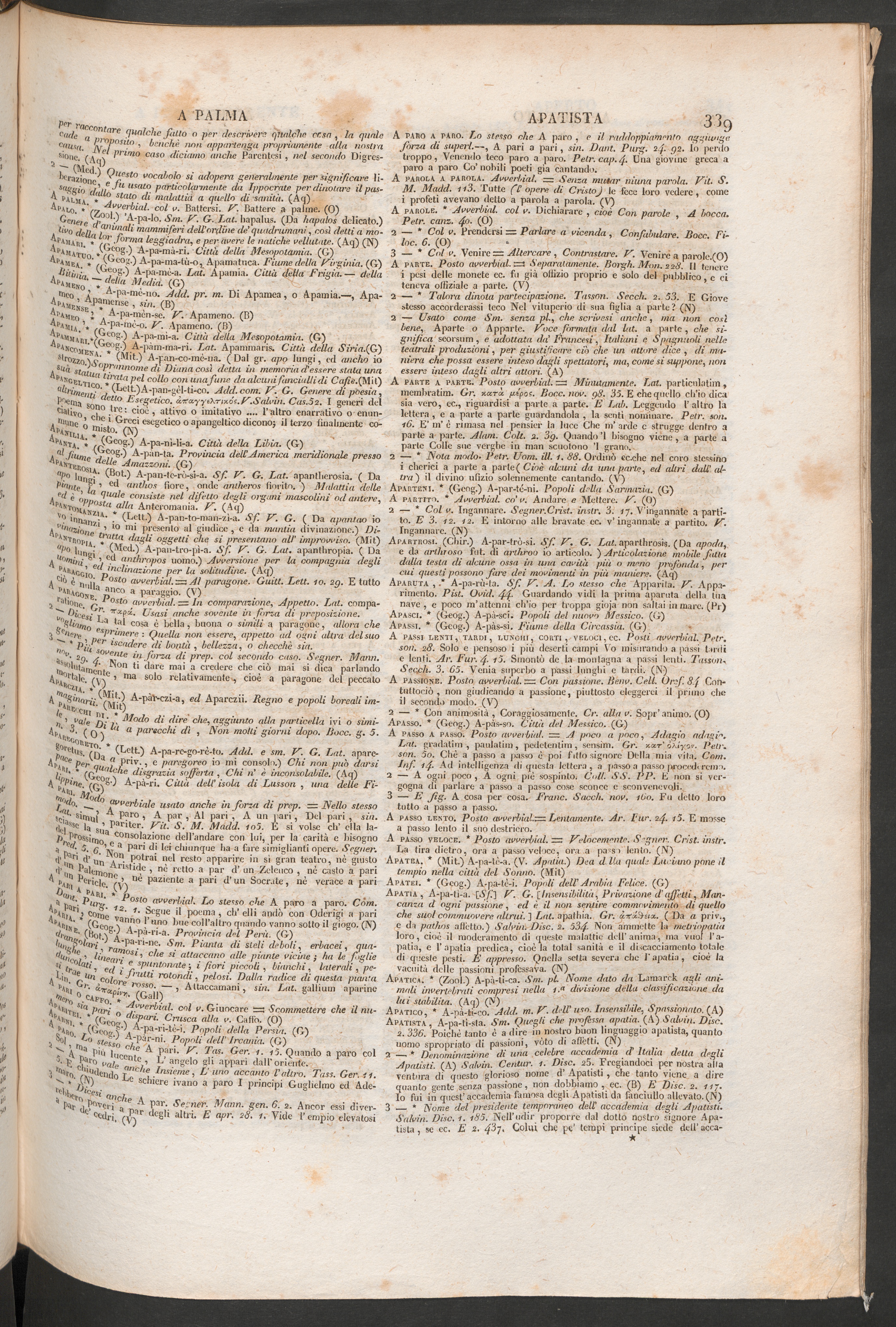 2 — * Con animosità, Coraggiosamente. Cr. alla v. Sopr’animo. ( 0 )Apasso. * (Geog.) À-pàs-so. Città del Messico. (G)